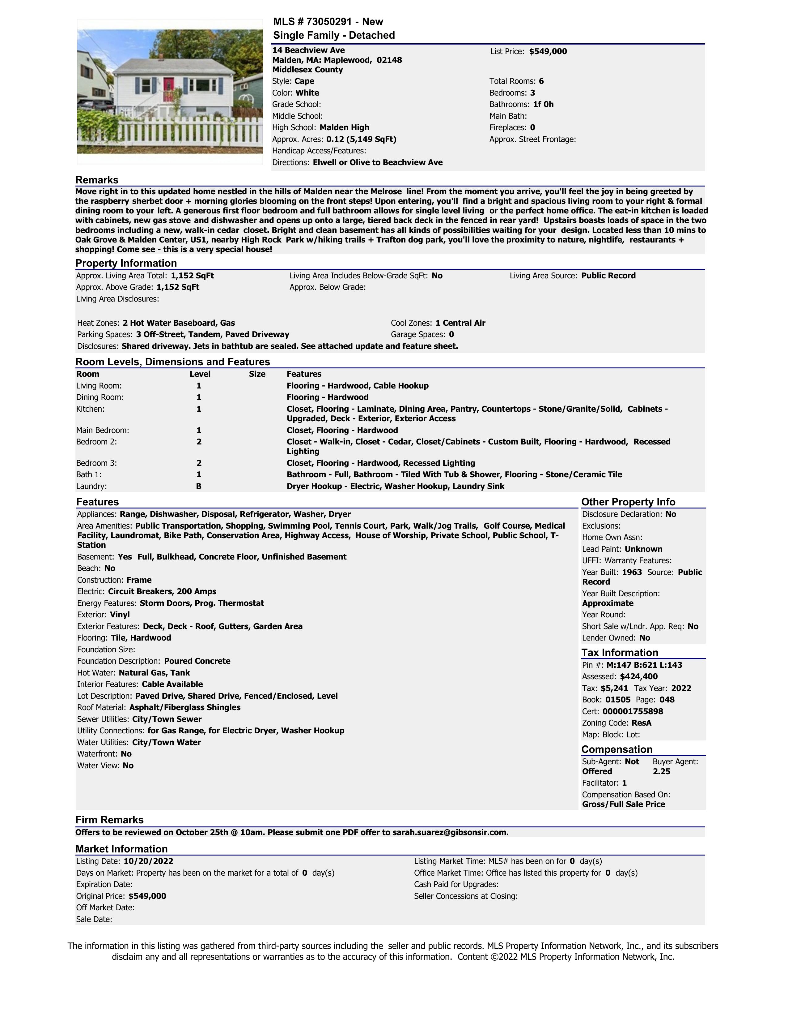 Move right in to this updated home nestled in the hills of Malden near the Melrose line! From the moment you arrive, you'll feel the joy in being greeted by the raspberry sherbet door and morning glories blooming on the front steps! Upon entering, you'll find a bright and spacious living room to your right and a formal dining room to your left A generous first floor bedroom and full bathroom allows for single level living or the perfect home office. The eat in kitchen is loaded with cabinets, new gas stove and dishwasher and opens up onto a large, tiered back deck in the fenced in rear yard! Upstairs boasts loads of space in the two bedrooms including a new, walk in cedar closet Bright and clean basement has all kinds of possibilities waiting for your design. Located less than 10 mins to Oak Grove and Malden Center, US1, nearby High Rock Park with hiking trails and Trafton dog park You'll enjoy the proximity to nature,nightlife,restaurants,and shopping! Come see this very special house!