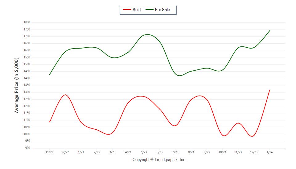Average For Sale Price (in thousand) in January 2024 was $1741. It was up 7.4% compared to last month and up 7.7% compared to last year.