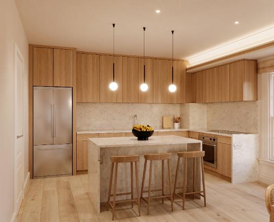 High-end finishes include custom cabinetry,sleek stonesurfaces,premium appliances,and integrated lighting throughout