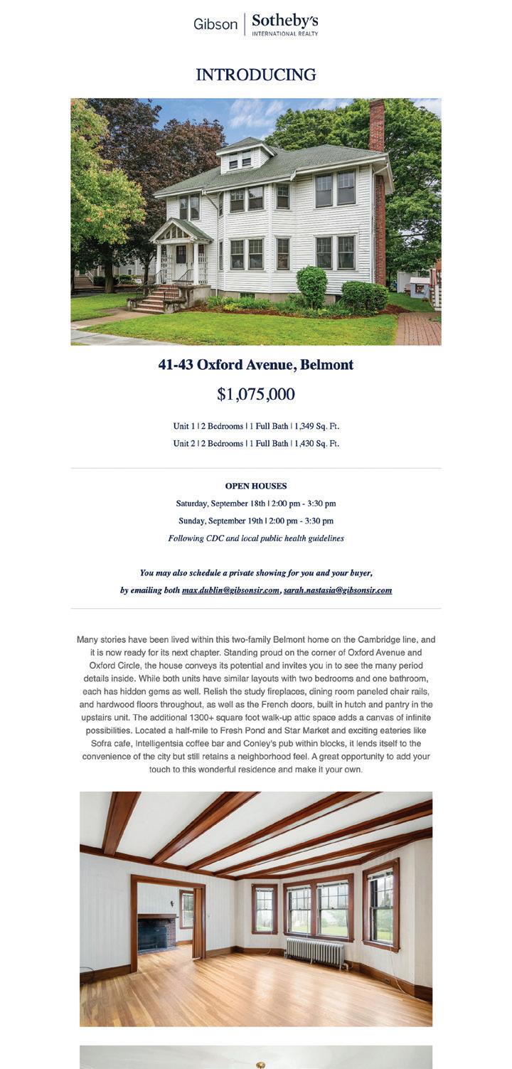 CAMBRIDGE 5BEDS|3F2HBATHS|4,484SQ.FT. $3,495,000 LindsayAllison&LisaMay|617.429.3188 Lisa.May@GibsonSIR.com 44AVONHILLSTREET CAMBRIDGE 4BEDS|2.5BATHS|2,096SQ.FT. $1,465,000 AnneFantasia|617.201.5883 Anne.Fantasia@GibsonSIR.com