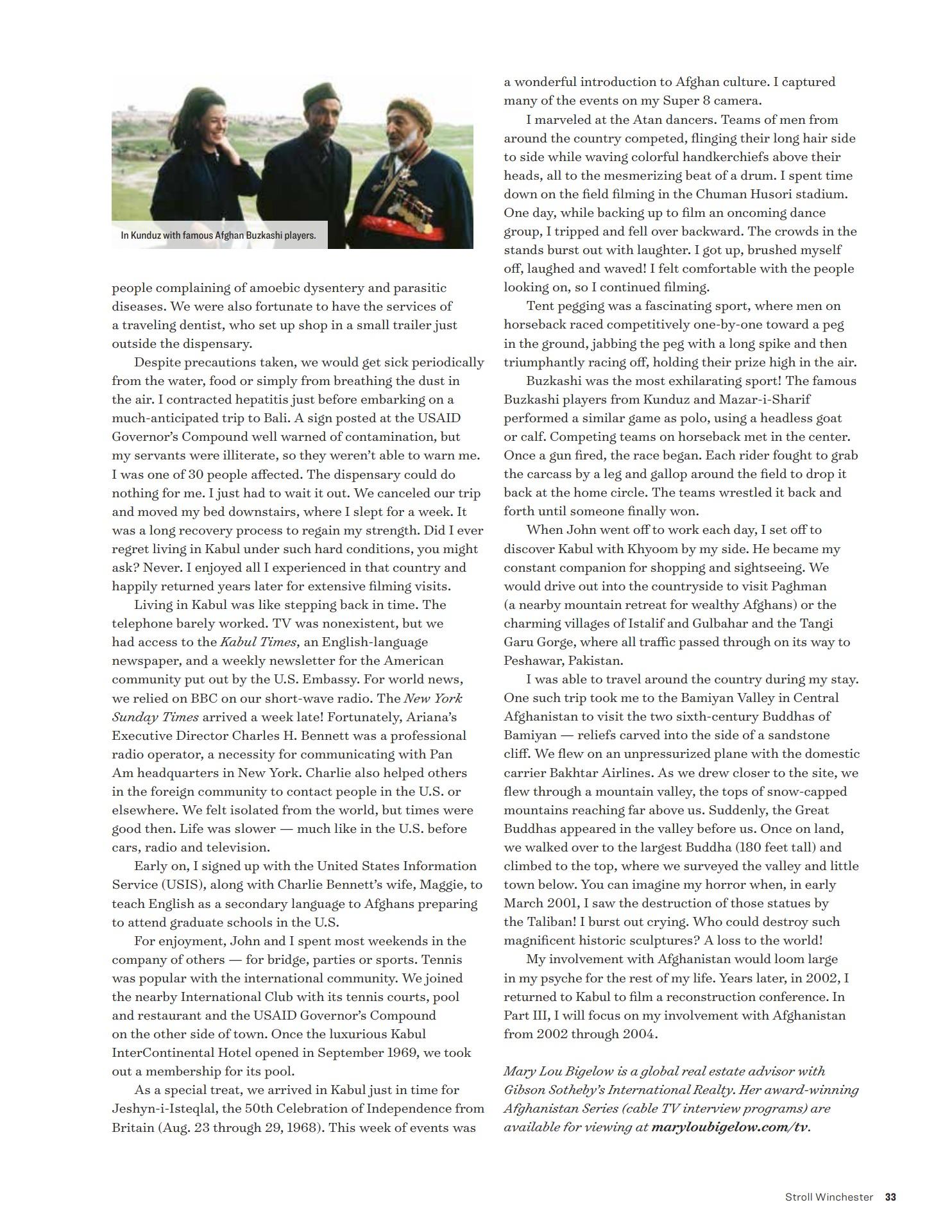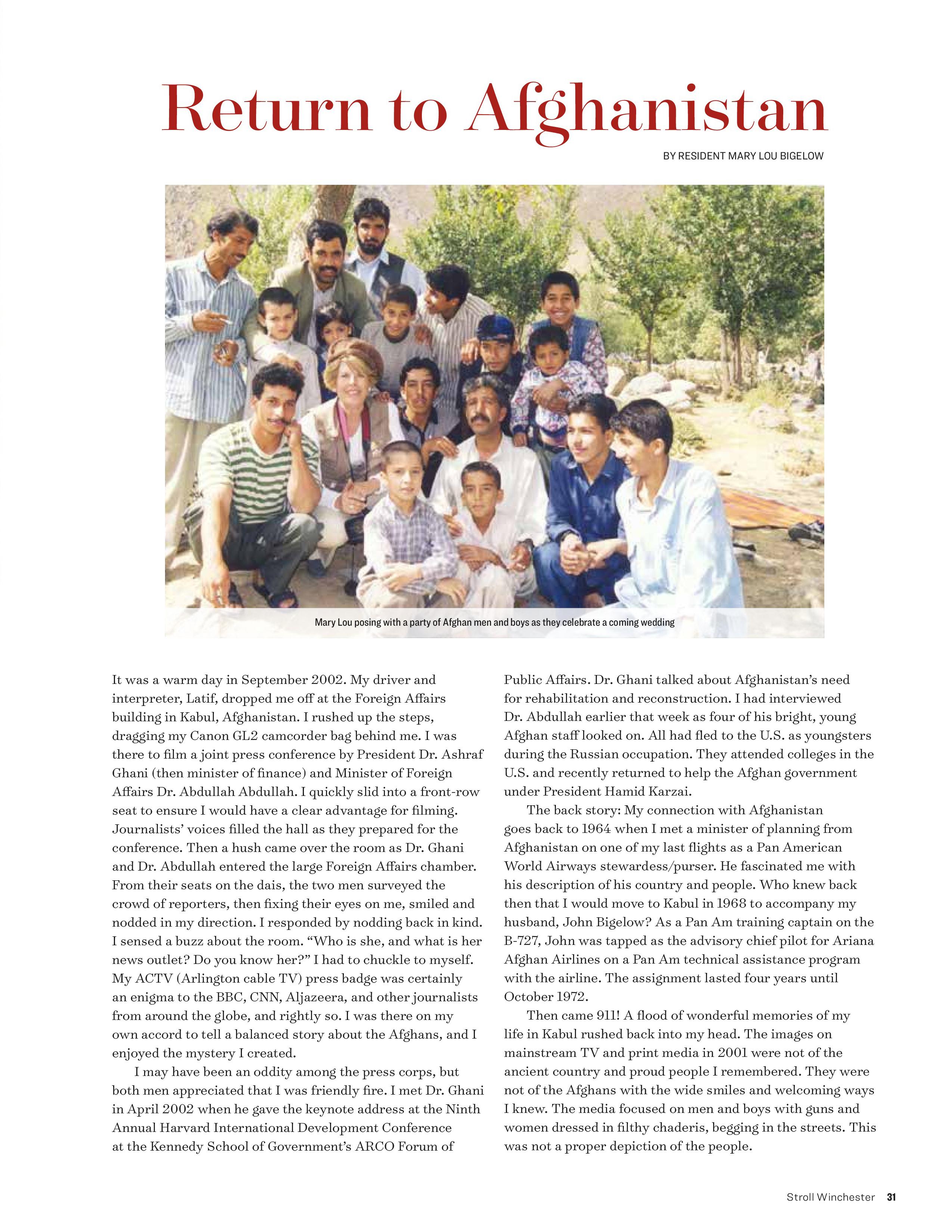After 911, I initiated an Afghanistan Series for my Mary Lou Bigelow Show with ACMI (Arlington Community Media Inc.) as a venue for Afghans to tell their own stories. In 2002 and 2004, I returned to Afghanistan (where I lived from 1968 to 1972) for filming, and, in 2003, won the Alliance for Community Media’s (ACM) award in the international category To view my interviews, go to maryloubigelowcom.tv.