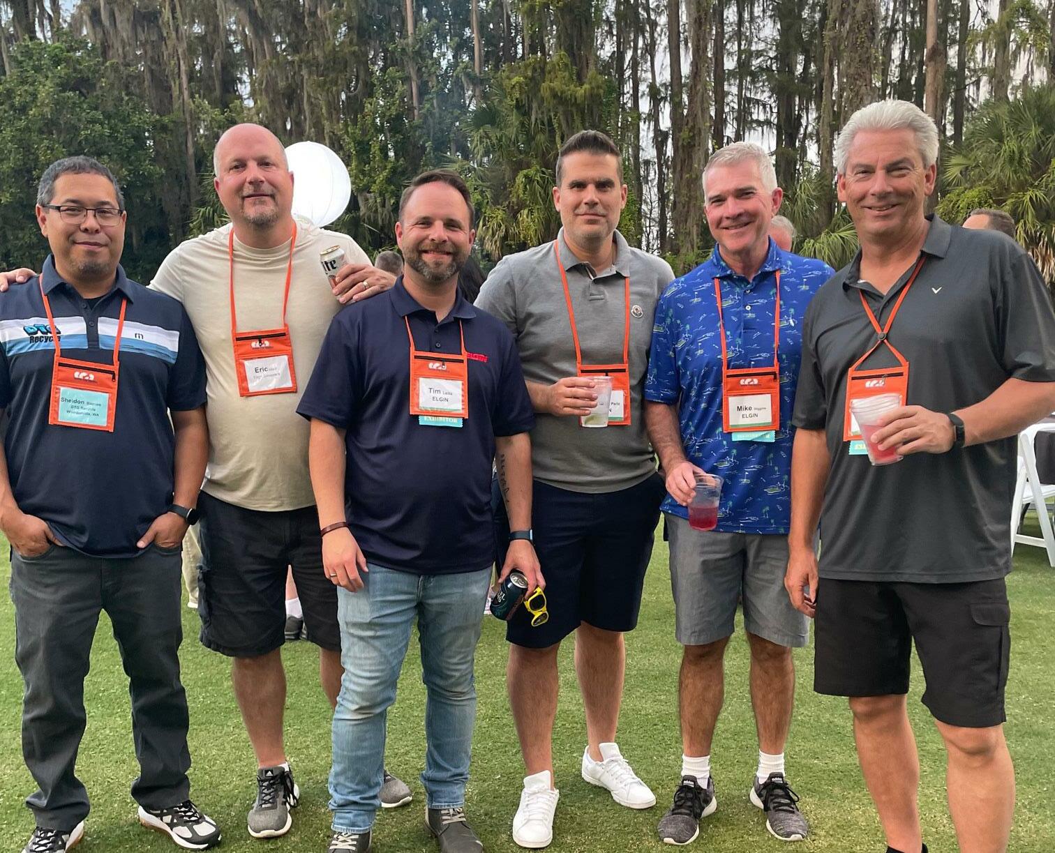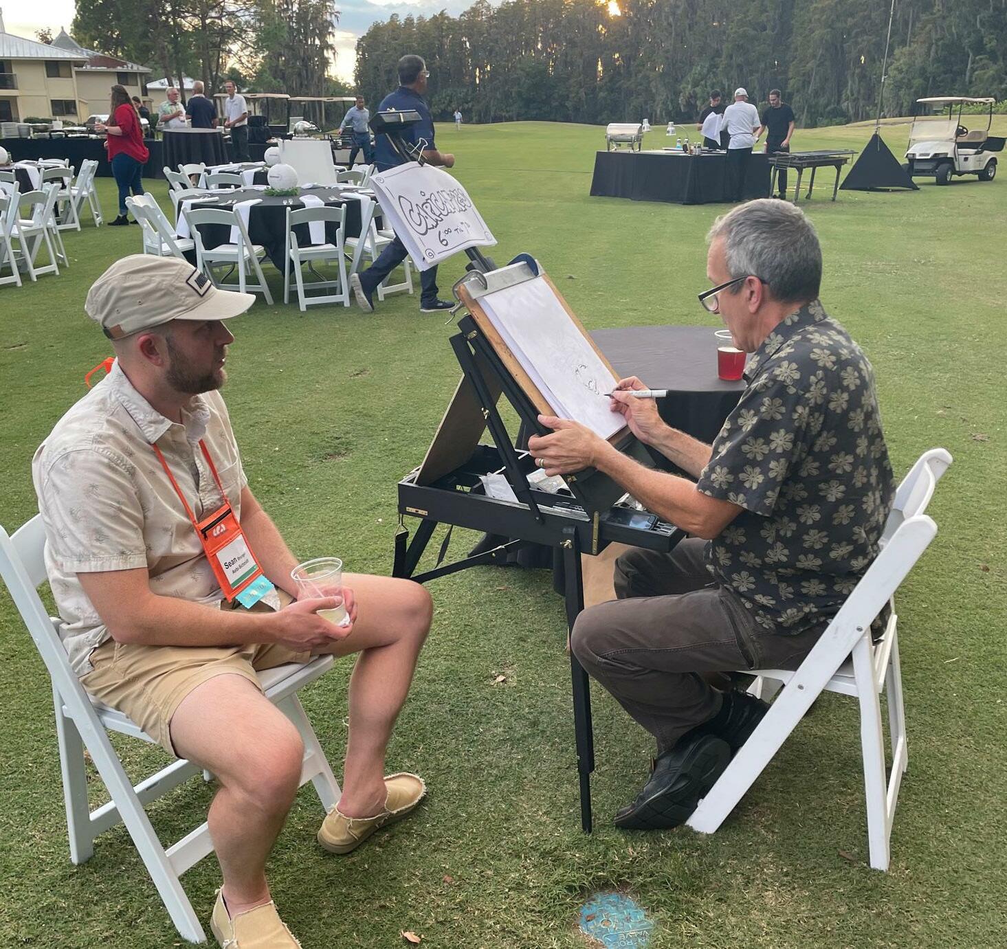 right now to hire with certainty, lead with purpose and keep your people engaged to help you crush your goals! Our speakers and sessions were informative and interactive and kept the crowd engaged over the 2 days. Our Equipment Expo and Exhibitor show was a hit with 30 vendors on display. The Cocktail Reception, sponsored by Kimball-Midwest, on Wednesday evening was held in the Exhibitor’s area as well as outside in the Expo area. We finished with a group dinner on Thursday night on the 18th Green of the Saddlebrook Golf Course complete with a caricature artist. We made it through dinner before a heavy rain shower made everyone retreat from the golf course and into the bar for night caps. Everyone was wet, but all in good spirits!