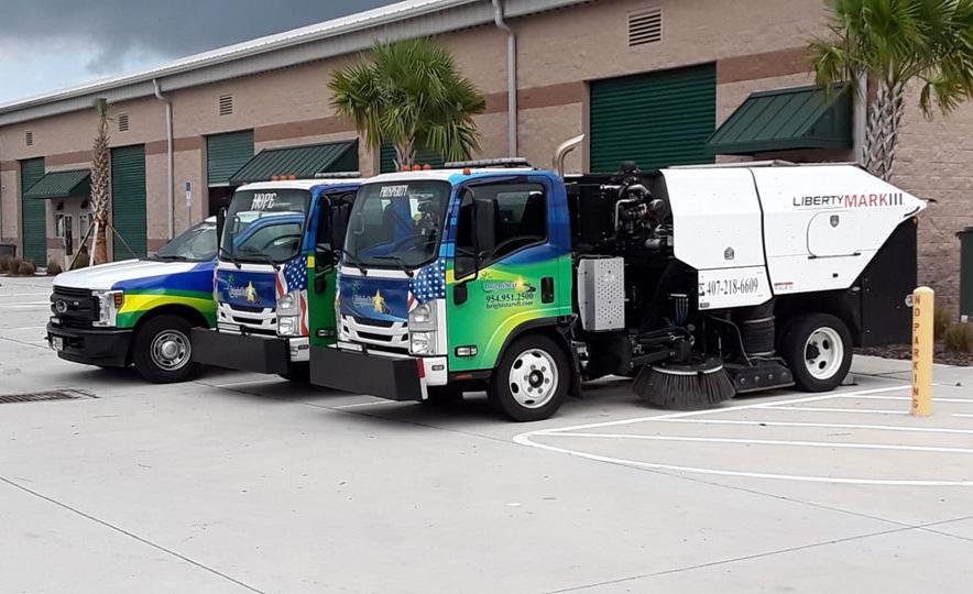 Currently, we have our fleet of sweepers, including for sweeping garages, our official service truck, and one water truck. We just ordered a T600 from Victory. We own all of our equipment for landscaping. (We bought most of that from Green Thumb Garden in Coral Springs. (We bought some of our asphalt equipment from (Browns and) places that equip rental businesses. We buy the equipment and refurbish it for our use.