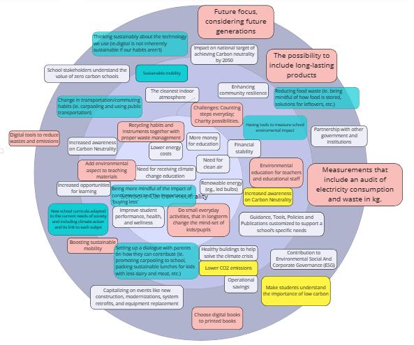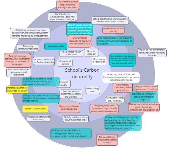 Kiti veiksniai, kuriuos mokyklos iš viso nurodė kaip prioritetinius, sutampa su šiais trimis veiksniais. Iš tiesų, poreikis sumažinti energijos sąnaudas jungia atsinaujinančios energijos naudojimą, kuris dažnai yra būdas sumažinti energijos sąnaudas trumpuoju ir vidutinės trukmės laikotarpiu. Veiksnys „Mokytojų ir švietimo darbuotojų aplinkosauginis švietimas“ susijęs su didėjančiu visų informuotumu apie anglies dioksido neutralumą.