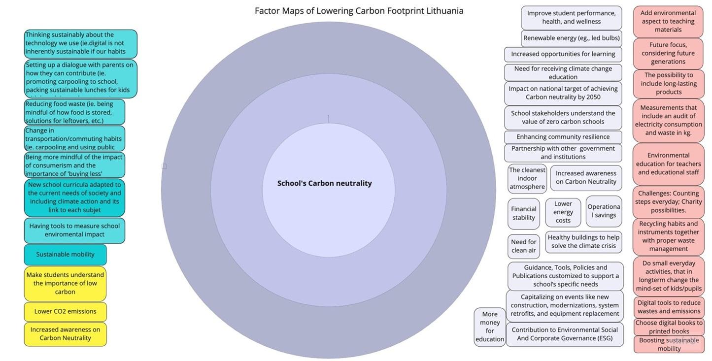 Primename, kad šiais veiksnių / faktorių žemėlapiais siekiama nustatyti svarbius veiksnius, kurie padėtų sumažinti švietimo įstaigų išskiriamo anglies dioksido pėdsaką. Šie veiksniai turės įtakos e-mokymų kurso „Organizacijos mažo anglies dioksido kiekio ekspertės“ turiniui, kuris bus nemokamai prieinamas mokykloms, aukštosioms mokykloms, profesinėms mokykloms ir visoms kitoms suinteresuotoms Europos švietimo organizacijoms, kad jos, remdamosi išklausytu įvadiniu kursu, galėtų pradėti vykdyti savo mažo anglies dioksido kiekio švietimo programas.