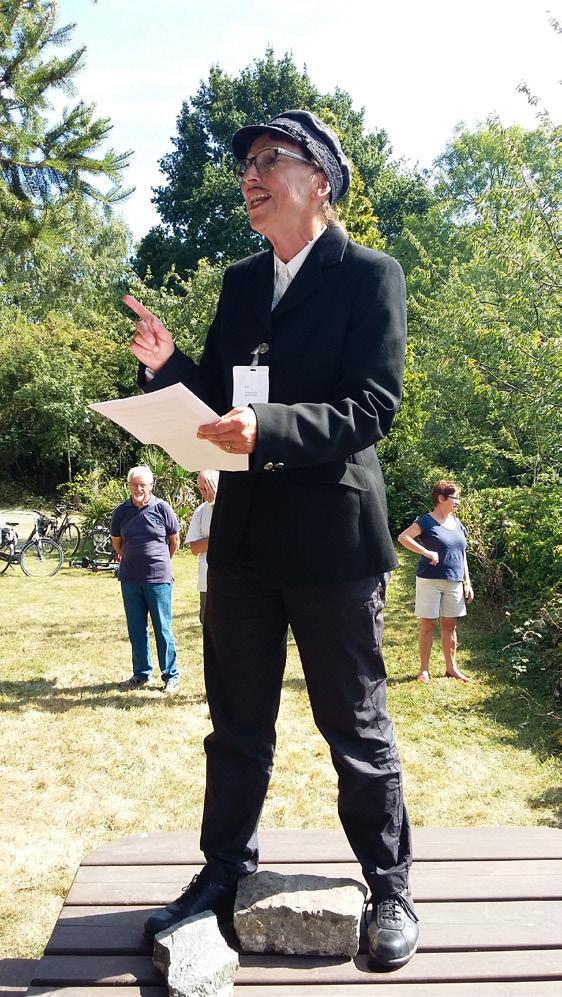 Lessines. Van bij de start van deze ‘collaboration intercommunautaire’ was het duidelijk dat het feest nu een tweedaags Festival zou zijn, met op de eerste dag een DenderBalade à la Dendre, een fietstocht langsheen de kabbelende Dender die de twee steden met elkaar verbindt. De start ervan was in Lessen, onder leiding van de uitmuntende actrice Andrea die het verhaal vertelde van Louis Scutner, een goede vriend van schilder Magritte. De vertelling leidde de fietsers langs enkele opvallende plaatsen in Lessen, met als rode draad de geschiedenis van de stad: we bezochten de steengroeve, het magazijn van de Kringwinkel en de Sint-Pieterskerk temidden van ‘le festin’, het jaarlijkse renaissancefeest dat de hele stad vult met acteurs, eetstandjes en festiviteiten.