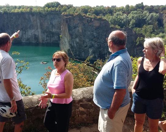Daarna bracht de fietstocht ons richting Geraardsbergen, om via een tussenstop in het jazz-café ‘t Bruggenhuis meteen ondergedompeld te worden in het wielerkasseisteen-verleden van de stad, in de hall van het oude stadhuis op de Markt van de stad. Ervaren acteur, Herwig Deweerdt, liet er ons ter plekke proeven van de historie van de koereurs die sinds wielerheugenis de kasseien van de Muur hebben proberen temmen.