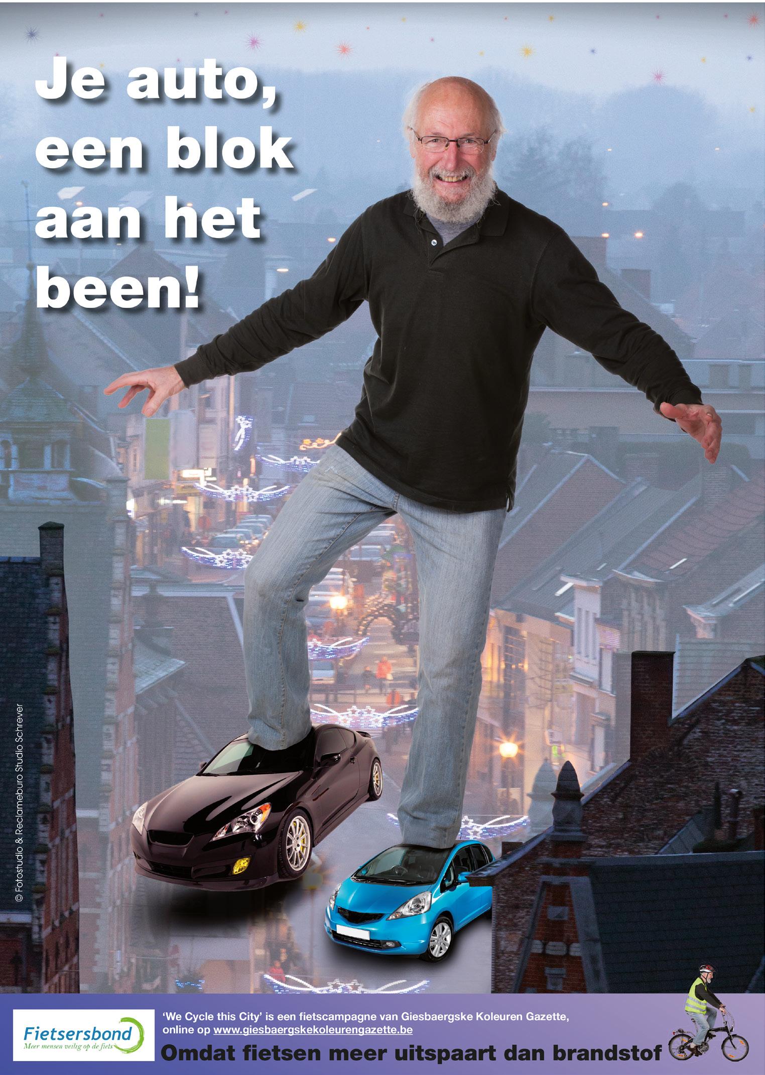 in de stad rijdt: je neemt (veel te veel) plaats in, je stoort je medemens met lawaai, gevaar, overlast, vervuiling en bovendien stoor je ook jezelf, want je raakt je auto niet kwijt’, vertelt de fotograaf en maker van de campagne Wim Schrever. ‘Bovendien sta je met de auto voortdurend in
