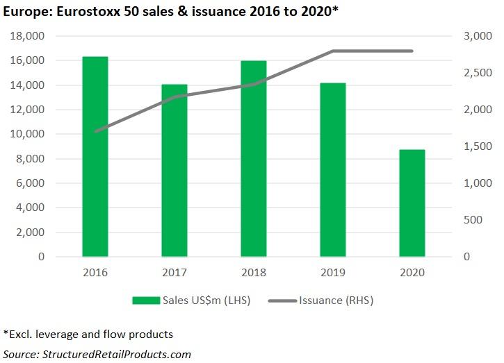 The trend to use proprietary indices has been visible since 2013 (with the exception of 2018 and 2019) and in 2020 was even sharper: by sales volume, approximately half of the structured products issued was linked to a proprietary index in Q4 2020.