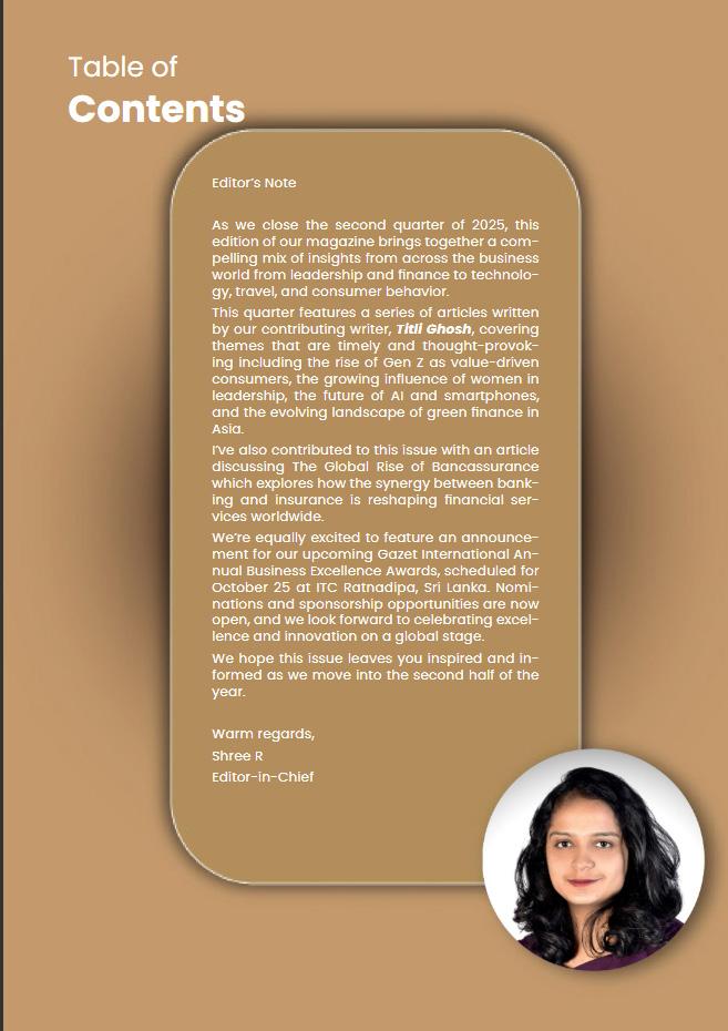 As we present the final issue of Gazet International for 2025, we also step into a new year filled with renewed ambition and opportunity. The last quarter is a natural moment of reflection, and this edition captures both the key developments that shaped 2025 and the outlook as we begin 2026. The past year brought notable shifts across global markets and business ecosystems. Changing strategies, evolving consumer behaviour, and economic recalibration tested organisations worldwide. In this issue, we curate perspectives that help our readers understand these changes while preparing for the road ahead. Our contributing writer, Titli Ghosh, offers insightful articles examining market structures, cultural influence on business, and future financial trends. I have also contributed an article focusing on the growing importance of recognition and brand enhancement programs as strategic investments for sustainable business growth in 2026. At Gazet International, we strongly believe that recognition plays a vital role in building credibility, trust, and long-term brand value. Over the years, our Business Excellence Awards have been hosted as virtual events, enabling us to connect with a global audience. As we move into the new year, we are excited about the possibility of hosting the awards on a larger, live platform. While the final format will be announced in due course, our commitment to celebrating excellence remains unchanged. We invite our readers and clients to actively participate, nominate their organisations, and be part of this growing platform. This edition features a diverse range of articles spanning business, finance, current affairs, lifestyle, and the environment, reflecting the themes that defined the year. As we begin 2026, we wish our readers continued growth and success—professionally and personally. Embrace the opportunities ahead and let this year be one of meaningful progress.