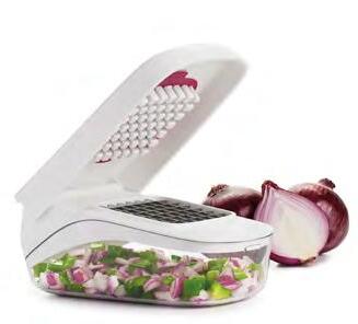 OXO Good Grips grøntsagshakker gør det nemt at hakke frugt og grønt i tern. Læg et stykke frugt eller grønt på knivbladene. Tryk låget ned, og dine frugt- eller grøntsagstern falder ned i opsamlingsskålen. Derefter kan du fra en stor åbning i den ene side nemt hælde dem direkte ned i salatskålen eller bradepanden. Alle dele kan vaskes i opvaskemaskine.