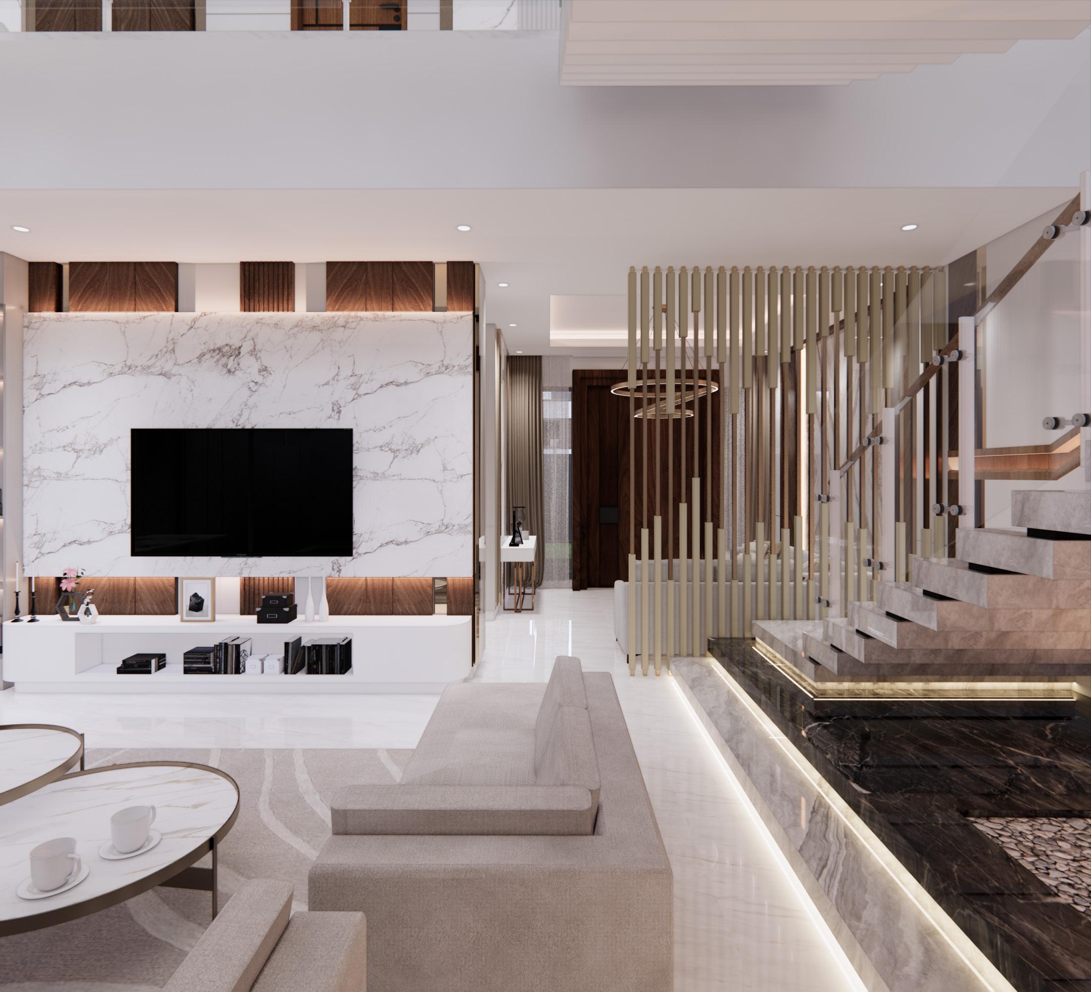 Owners of this project wanted a large void in theing area to create a stunning impression. A spacious living room was another requirement, since they were accustomed to having one in their previous houses. They asked for a modern design that was masculine but cozy, so we decided to combine steel, marble, and wood for both the exterior and interior.