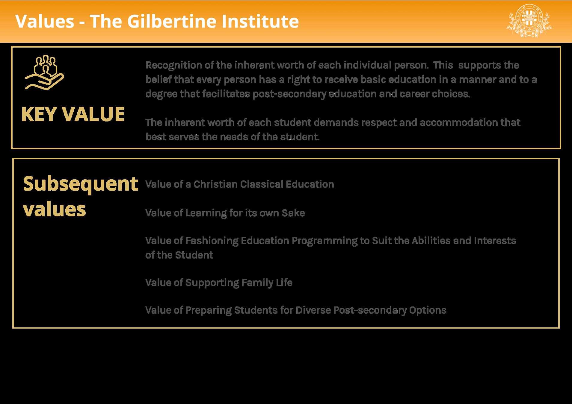 A school authority under the Alberta Education Act, e Gilbertine Institute of Catholic Studies ( e "Gilbertine Institute" or "Institute") is animated by a vision of facilitating a variety of educational endeavours that acknowledge parents as the primary educators of their children. e Institute adheres to the teaching authority of the Catholic Church with content and delivery that is Good, True, & Beautiful.