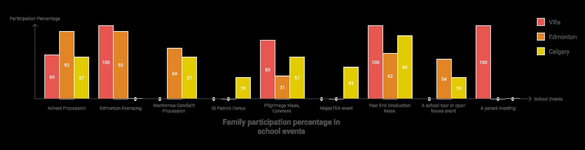 • Family participation in school events was stronger than previous years. Note: parent survey for Edmonton and Calgary neglected to ask if parents had attended at least one parent meeting. Results would have been comparable to those of Villa Spiritus.
