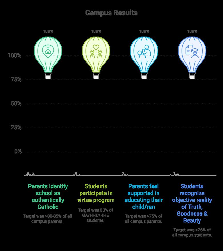 Target: >80-85% of parents identify the school as authentically Catholic, and 80% of GA/HHC/HHE students participate in the virtue program. >75% of parents feel supported in fulfilling their obligation to educate their children in faith, virtue, and academics. >75% of students recognize truth, goodness and beauty as objective realities.