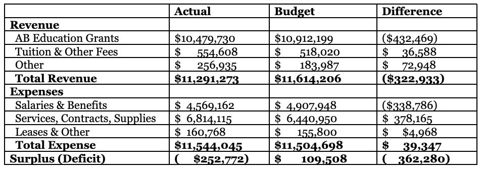 On the surface, our deficit appears to be the result of below budget AB Education Grants. It appears that way because we do not recognize as revenue the portion of Home Education Grants targeted for Home Education Parent Reimbursements until these funds have been used to reimburse parents in a given year. This also results in an equal reduction in expenses, so that there is no net effect on the Surplus (Deficit).