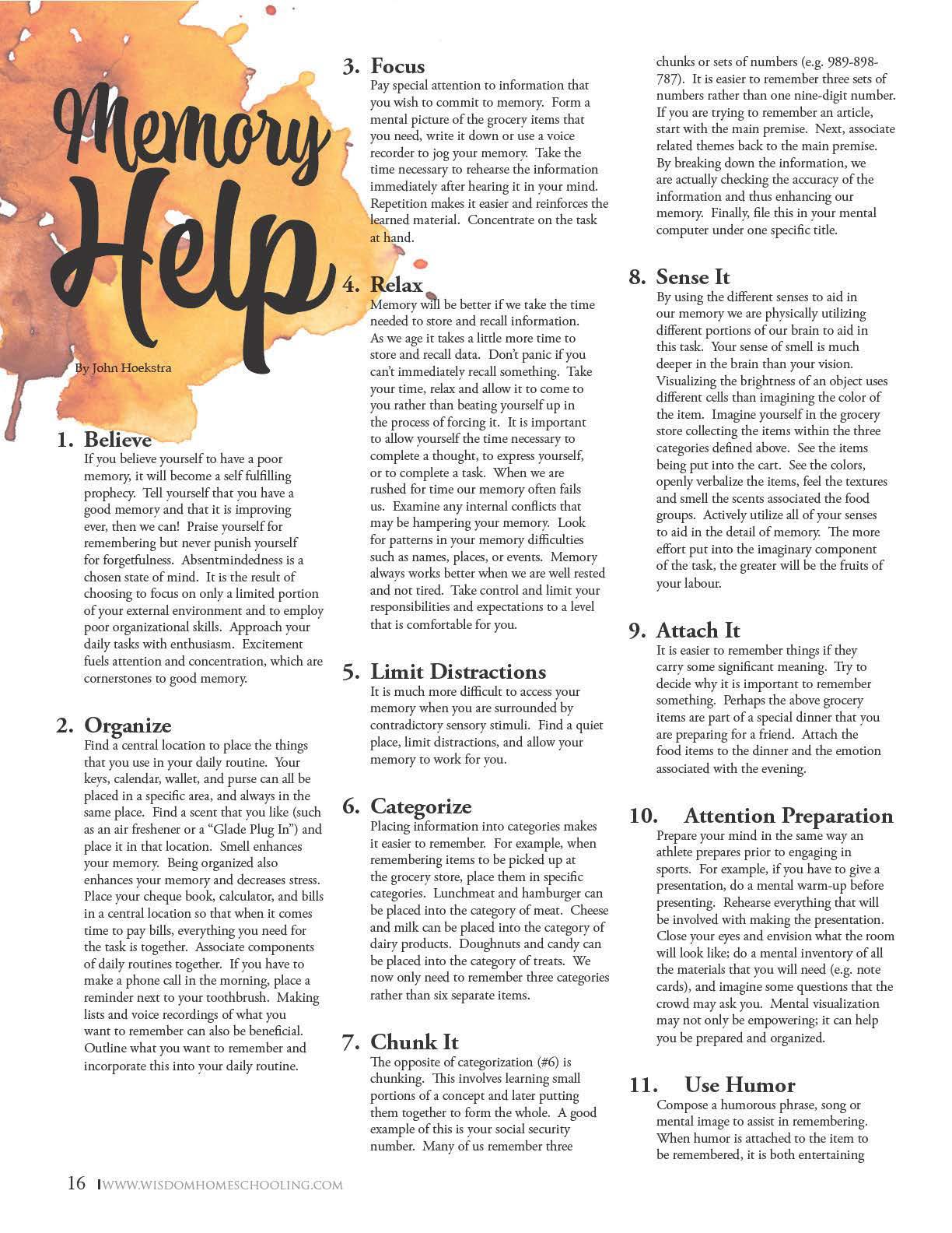 Always ask yourself a simple question: “What is another way I can look at this problem?” Rigid thinking is often a precursor to poor memory. Examine the problem at hand. Turn it over and look at it from all angles. Put it down and do the same later. Examining things from different perspectives forms more memory associations. Creativity and flexibility also allow us to find more ways to access the information to be recalled.