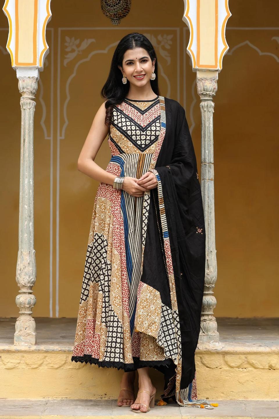 An ethnic set like a block print suit set is the perfect opportunity to play with different colours and patterns as they are available in a lot of colours and styles