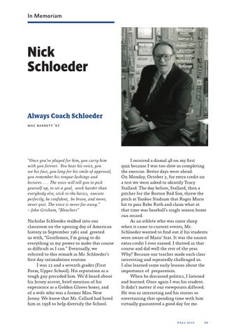 Nicholas Schloeder walked into our classroom on the opening day of American history in September 1961 and greeted us with, “Gentlemen, I’m going to do everything in my power to make this course as difficult as I can.” Eventually, we referred to this remark as Mr. Schloeder’s first day intimidation routine. I was 12 and a seventh grader (First Form, Upper School). His reputation as a tough guy preceded him. We’d heard about his Jersey accent, brief mention of his experience as a Golden Gloves boxer, and of a wife who was a former Miss New Jersey. We knew that Mr. Callard had hired him in 1958 to help diversify the School.