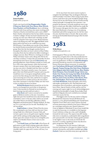 1980 James Franklin jim@franklin-group.com I had a nice lunch with Jay Hergenroeder, Charlie O’Donovan, Mark Licht, Dave Mason, Hans Wittich, Steve Plunkert and Paul Hazlehurst. Jay is still doing very well with Gray and Sons, but misses working with Charlie as Charlie switched firms and is now at M&T Bank. Charlie informed me that his first child is starting to look at colleges. At least we know Charlie won’t be retiring any time soon. Mark Licht still helps my dad with his computer from time to time. Mark’s business seems to be doing very well. We suggested Mark settle down and tie the knot so we could have one more HUGE party. C’mon Mark, you can do it! Dave Mason has himself firmly entrenched with Franklin Financial group. Now that the firm bought another firm in Annapolis, Dave does not have to drive to Hunt Valley every day. Dave also has told me his eldest is looking at colleges now too. Hans Wittich is working out in Hunt Valley with Solar Gaines and is doing well. He has his two boys at Gilman. It seems like just yesterday we were driving back from Ocean City with Alan Livesy and getting pulled over. Steve Plunkert joined us as well, and he is still in the carpet business. After the hurricane this past summer, Steve was kind enough to re-carpet my man cave after it flooded. And then there was Paul Hazlehurst. Our lunch started at noon. Can anyone guess what time Hazle posted? If anyone said 12:53, you would have won. It was great seeing Hazle and his practice has been doing very well. He has been very busy since venturing out on his own, and he has no regrets. We look forward to another lunch in the near future. Any other classmates in the Hunt Valley area that want to join us, please let one of us know. Roland Mackenzie barely missed the cut for the lunch as we bumped into each other at the grocery store. Unfortunately for Roland, he was leaving for a duck hunting trip and could not make it. John Zentz and I came in second in his member guest at Bellerive earlier in the year. I missed an eight-foot putt that would have won, but we had a blast nonetheless. Later in the year, John and his son joined me in New York to see the Big 4 (Metallica, Slayer, Megadeth and Anthrax) play at Yankee Stadium. As they say, if it is too loud, you are too old. Thankfully, I am not too old yet. Steph Jackson is taking T. Rowe Price by storm. He is enjoying his new firm, well not that new. I love seeing Steph out at Baltimore Country Club, and we have a great time on the golf course together. Steph and I will be making another pilgrimage to Bandon Dunes again this summer. If you are an avid golfer, you need to visit Bandon Dunes at least once in your golfing life. I see Geoff Carey and Tim Codd at Five Farms all golf season as well. Geoff is doing a great job at Brown Advisory, and Tim is still the “go to” doc in town for any shoulder needs. As a guy with a rotator cuff tear, I am living proof.