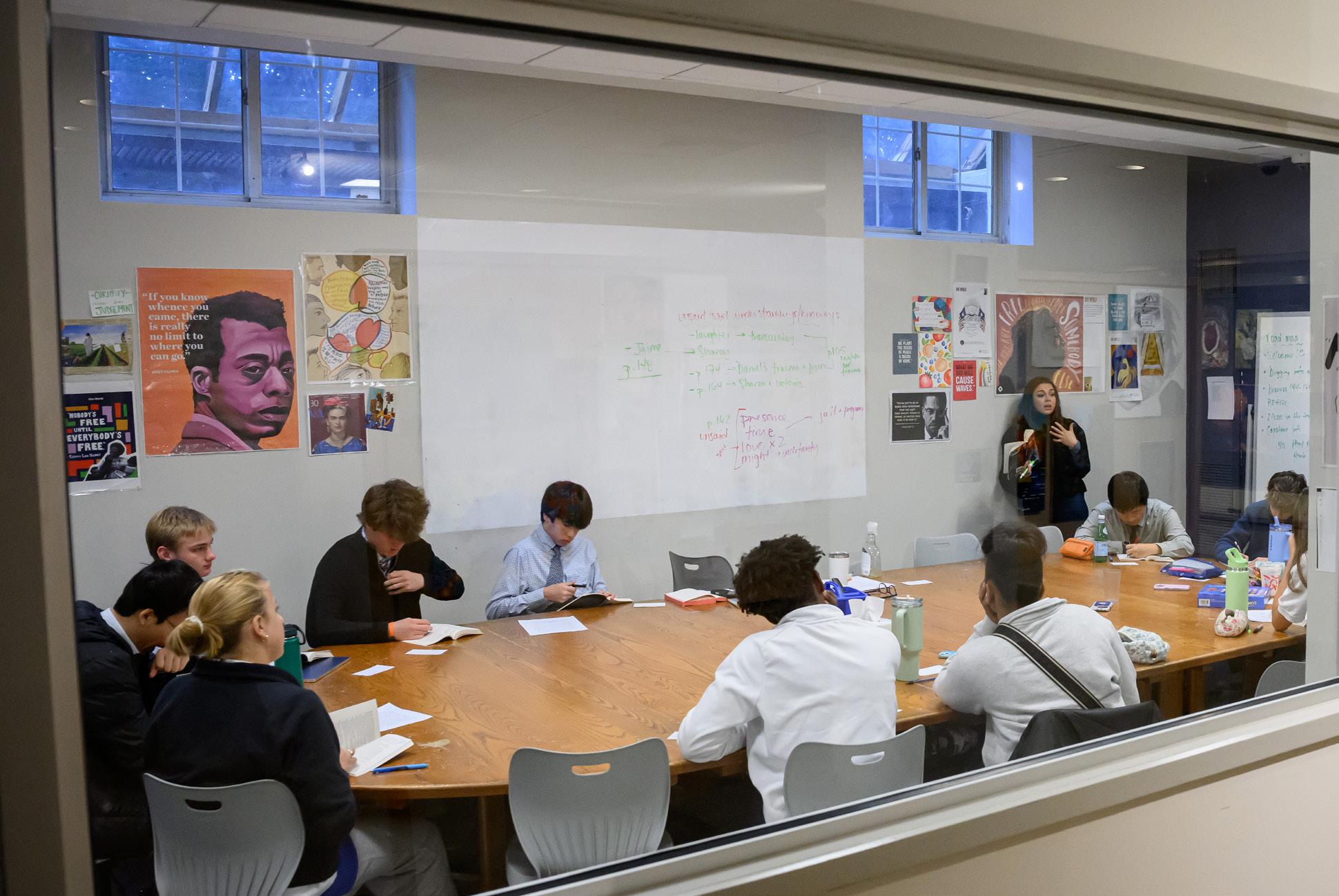 Seniors must take five courses that meet in the first three periods each semester. Seniors must take an English elective each semester. Seniors have many options available for arranging a rich program from a wide variety of tri-school electives. They may also take a course at Global Online Academy. Their advisor and the college counselors will help guide them toward wise selections. Schedules that do not include courses from the five major academic disciplines (English, Math, Science, Modern or Classical Language, and History) will receive special scrutiny. With special permission, a senior may do independent study with a Gilman teacher, or he might take an approved course at a college. Courses taken at educational institutions other than Gilman, Bryn Mawr, and Roland Park Country School must be paid for independently and thus represent costs beyond the Gilman tuition. Seniors also take a mandatory (non-credit) Senior Seminar that meets during the afternoon.