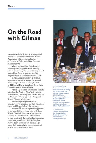 On the Road with Gilman Headmaster John Schmick, accompanied by various faculty members and Alumni Association officers, brought a bit of Gilman to California, New York and Massachusetts. A large group of Los Angeles area alumni joined together at the Beverly Hilton on January 18. Alumni living in and around San Francisco came together on January 20 at the Pacific-Union Club. In April, approximately 50 Gilman alumni and friends attended the annual Boston regional alumni event, hosted by Nikki and Harry Nudelman ’81 at their Commonwealth Avenue home. Nearly 150 Gilman alumni and friends attended the April 11 New York regional alumni event, hosted by Wm. Polk Carey ’48 and Francis J. Carey ’43 at the Racquet & Tennis Club in Manhattan. Freelance photographer Dana Underwood ’92 attended the San Francisco event and blogged about the evening. “One of the best things that happened to me as a child was being sent to Gilman School,” he said. “Outside of my parents, Gilman laid the foundation for my life to this point, and the further I get from my time there, the closer I feel to the place. Maybe I just appreciate it more as I get older. So I was really so excited to attend its San Francisco alumni event.”