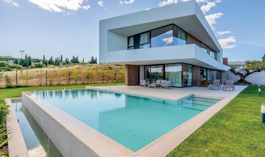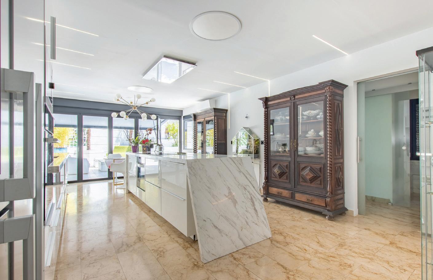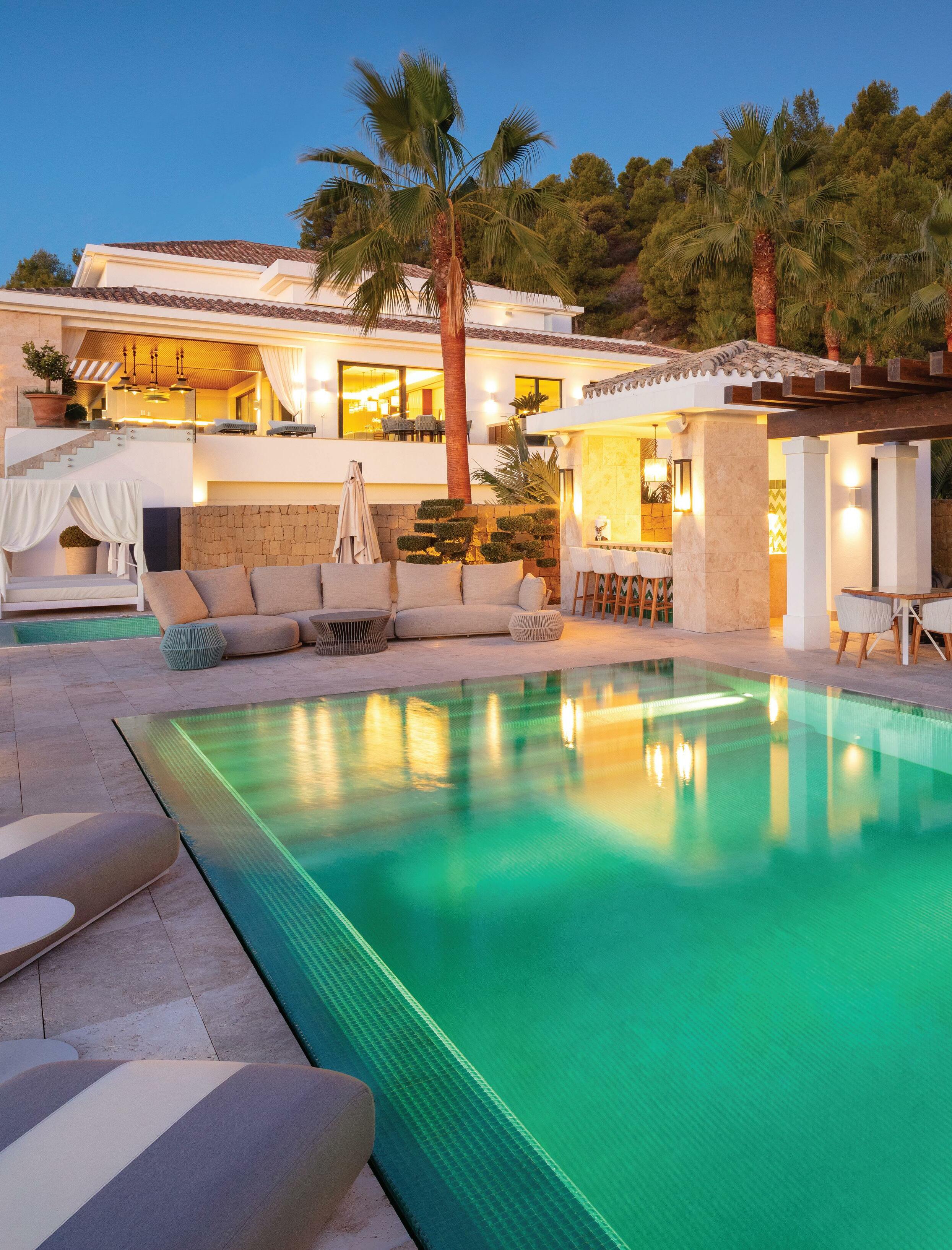 HAY QUE TOMARSE CON TRANQUILIDAD el recorrido por sus 4.674 metros cuadrados de parcela y los 2.449 construidos, a los que se entra a través de un suntuoso hall desde el que parten dos escaleras a ambos lados y que también da paso a una impresionante sala de estar… con vistas al Mediterráneo, claro. Entre sofás en tonos claros aparecen un área de televisión y una cocina de última generación con piano-bar, ambos conectados a amplias y elegantes terrazas para dejarse acariciar por el sol. En el jardín se suceden tumbonas y sillones que rodean una piscina, y al atisbar el nivel inferior se abre el edén: un spa con piscina cu bierta climatizada, hammam, sauna, gimnasio, sala de cine y dormitorios adicionales (en total, el chalet acoge nueve).