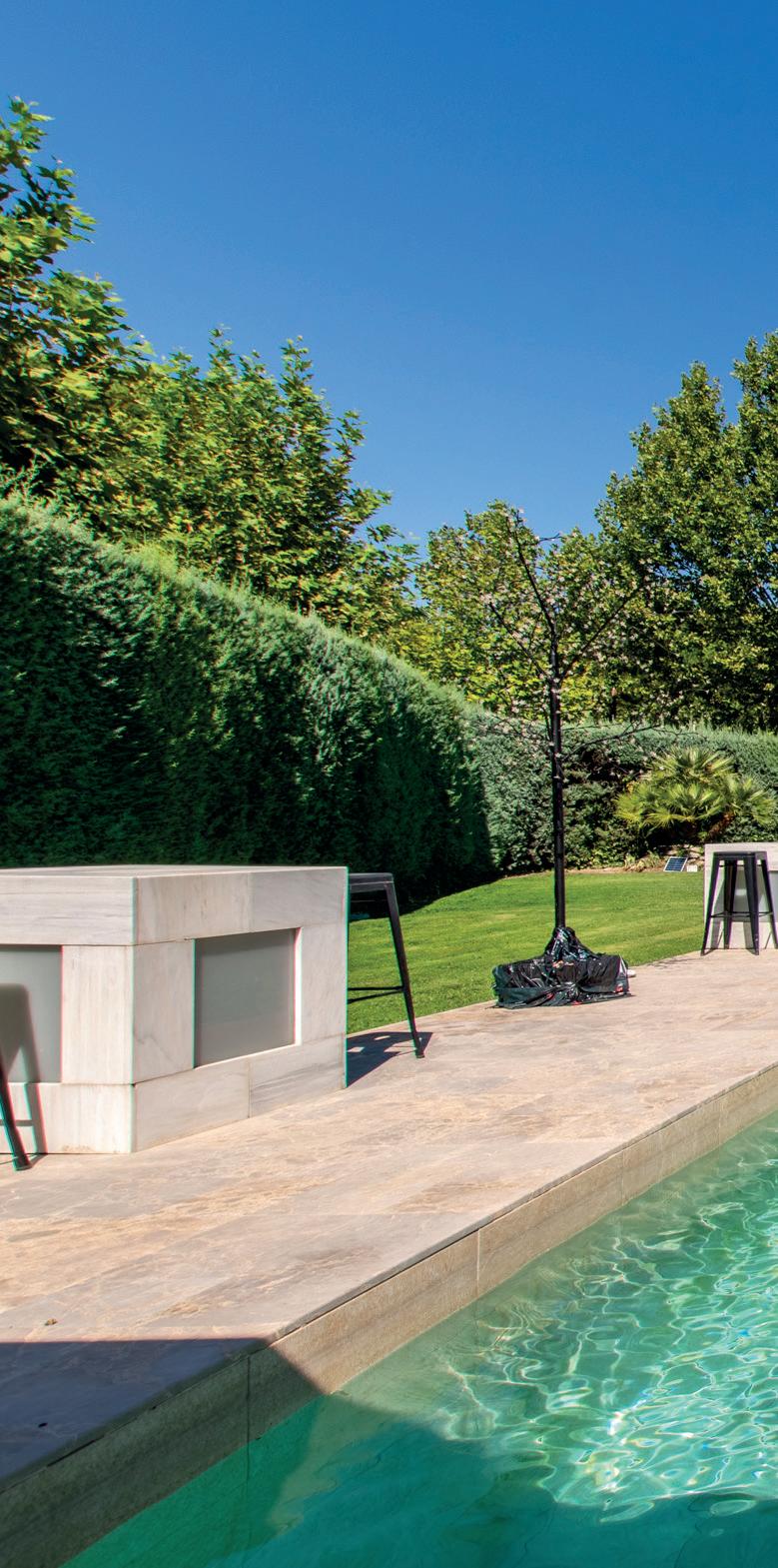 WE MUST TAKE IT EASY when moving through the 4,674 square metres of the plot and the 2,449 square metres living space, which we enter through a sumptuous hall with stairs on either side and which leads to an incredible living room… with views of the Mediterranean, of course. Among the light-coloured couches we see a television area and a latest-generation kitchen with a piano-bar, both connected to spacious and elegant terraces where you can enjoy some sunbath ing. In the garden there are loungers and armchairs surrounding the swimming pool, and the lower level of the home is a garden of Eden: a spa with an indoor heated pool, hammam, sauna, gym, private cinema and additional bedrooms (in total, the home has nine).