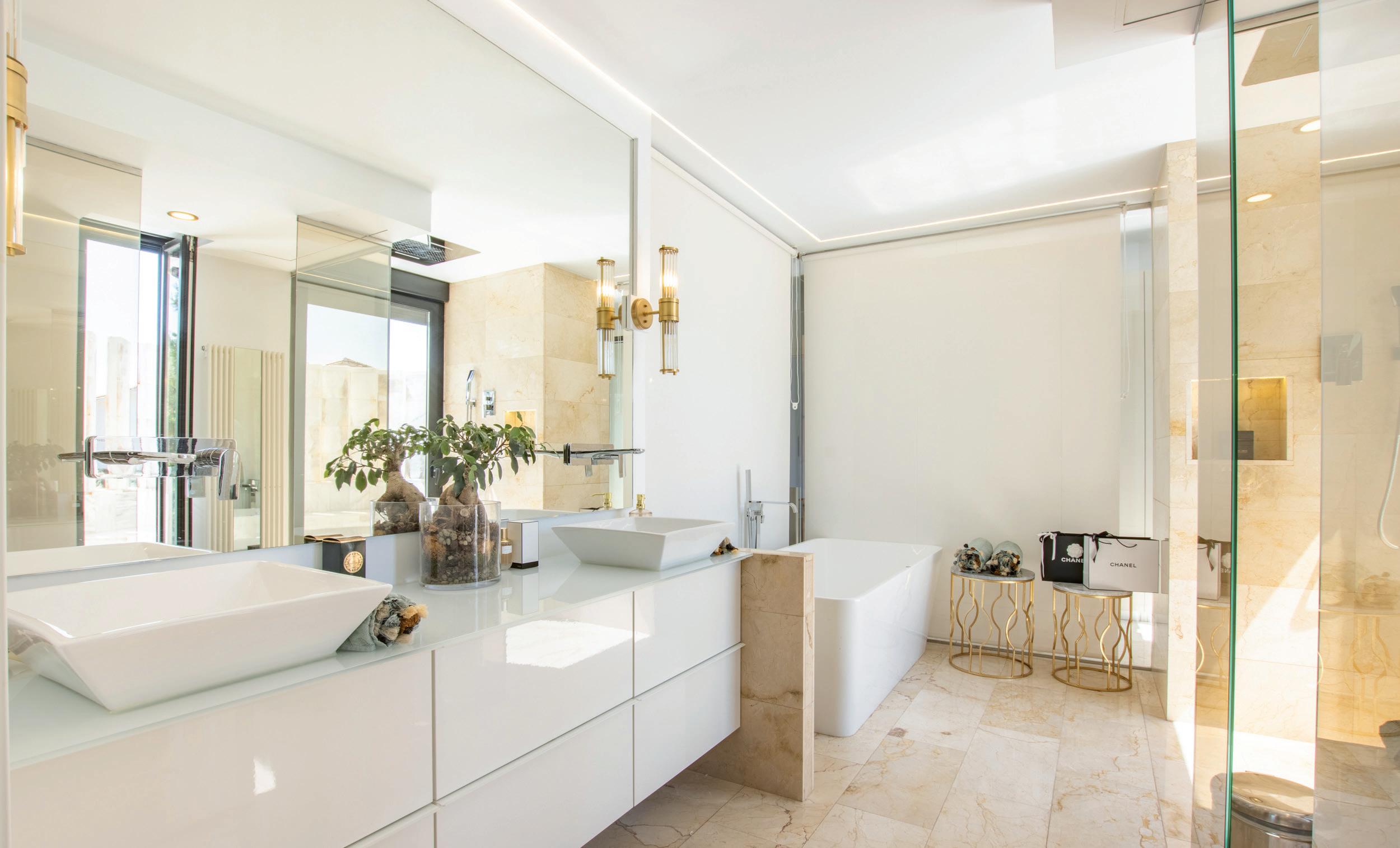 IT IS CALLED VILLA OLYMPUS and is located in the most pre mium private estate on the Costa del Sol: Cascada de Camoján. It’s like living in the most intimate and luxurious Olympus on the so-called Gold en Mile in Marbella. It is an independent chalet with three majestic floors, standing at the base of the Sierra Blanca mountains. Though it is more than just a house, it is a mansion that combines bright light and pure lines, typical of contemporary architecture, with warm and picturesque whites and ochres in the Mediterranean style. We can glimpse the sea from the balconies and open, pristine interiors, delighting in the sight of the blue sea and the waves from comfortable loungers, chairs and armchairs, as well as tall palm trees and leafy trees that surround the villa.