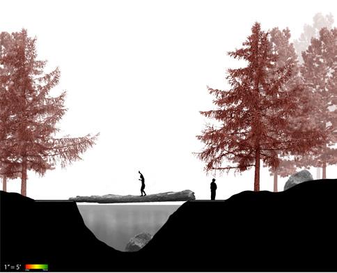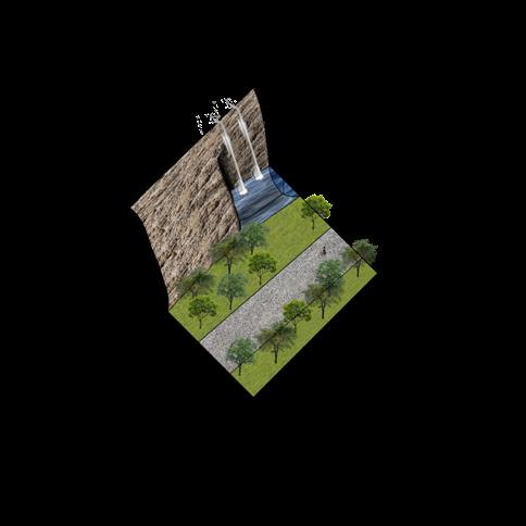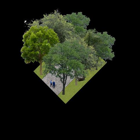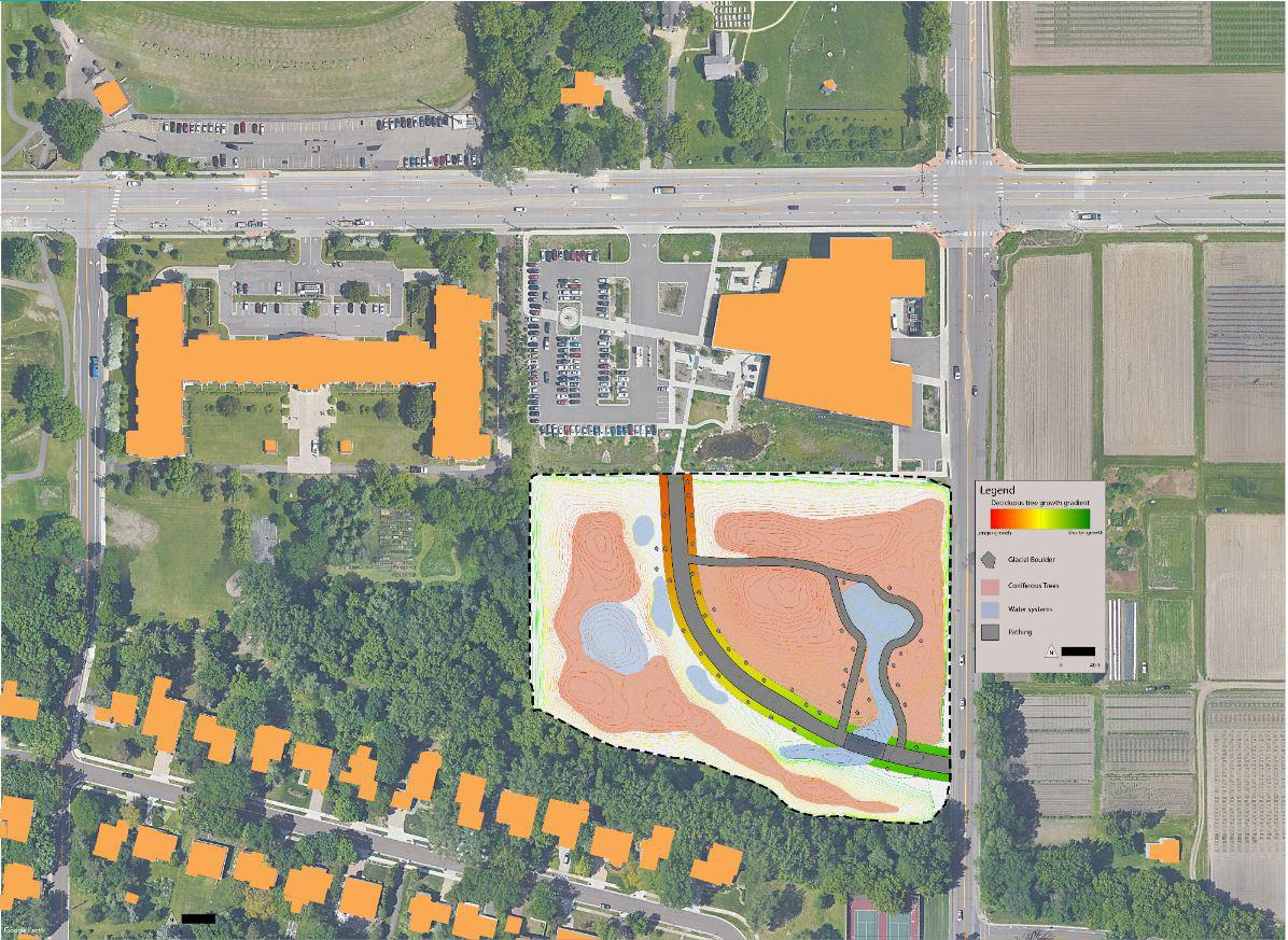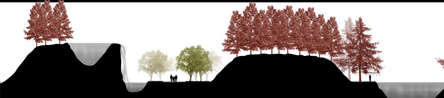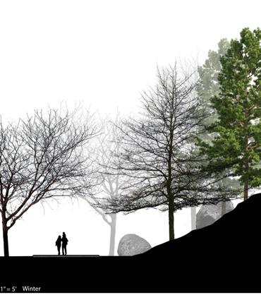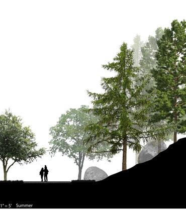 A tree garden is a living landscape that changes with time. This design tries to emphasize the change of the landscape through landforms reminiscent of the aftermath of ancient glaciers running through the site. The old growth coniferous trees on the hills contrasts the growing deciduous trees along the path. These deciduous trees are larger and more numerous to the north of the site, reflecting the slow movement of the theoretical glacier.