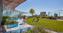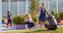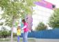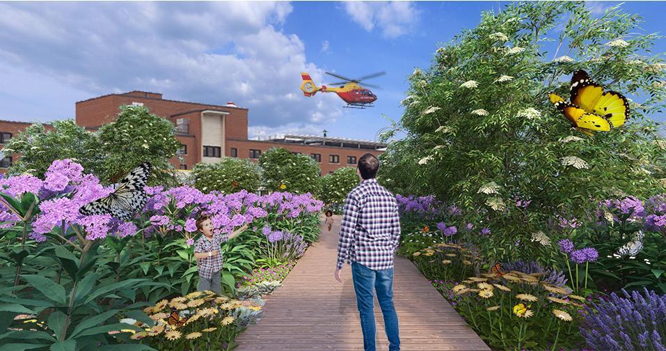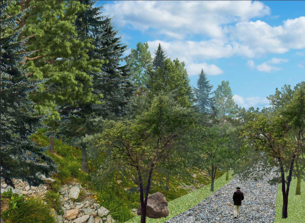 A render showing a patient walking with their chemobackpack near the western edge of the sensory garden.