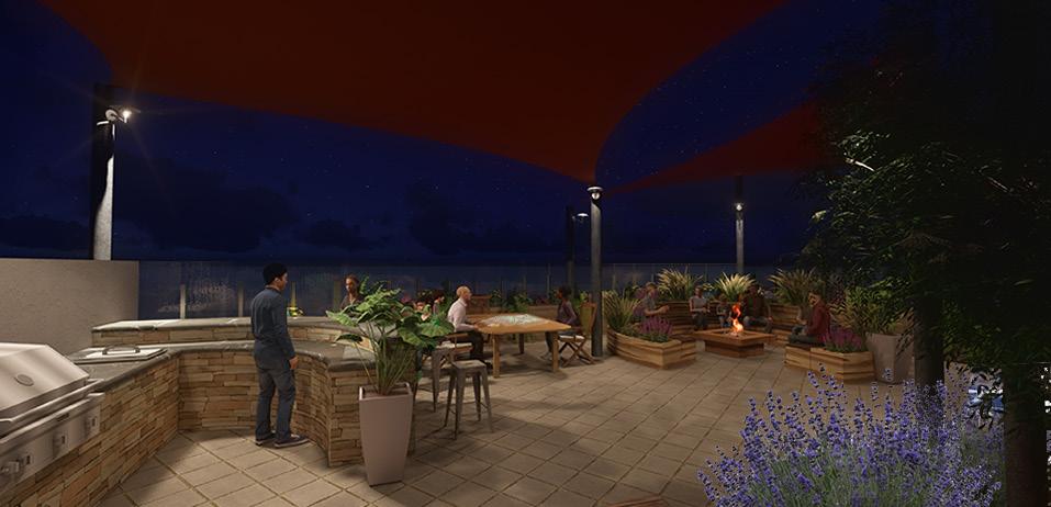 This is the main plaza space as you leave the main entrance of the rooftop. Designed with active spaces for kids as well as areas for viewing the city skyline and spaces to rest.
