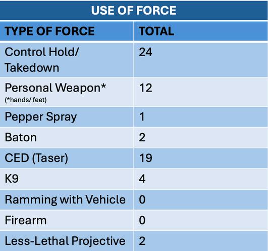 Of the total number of contacts the Gilroy Police Department had in 2023, only 48 resulted in a use of force. Of those 48 use of force incidents, 44 resulted in no injuries or minor injuries