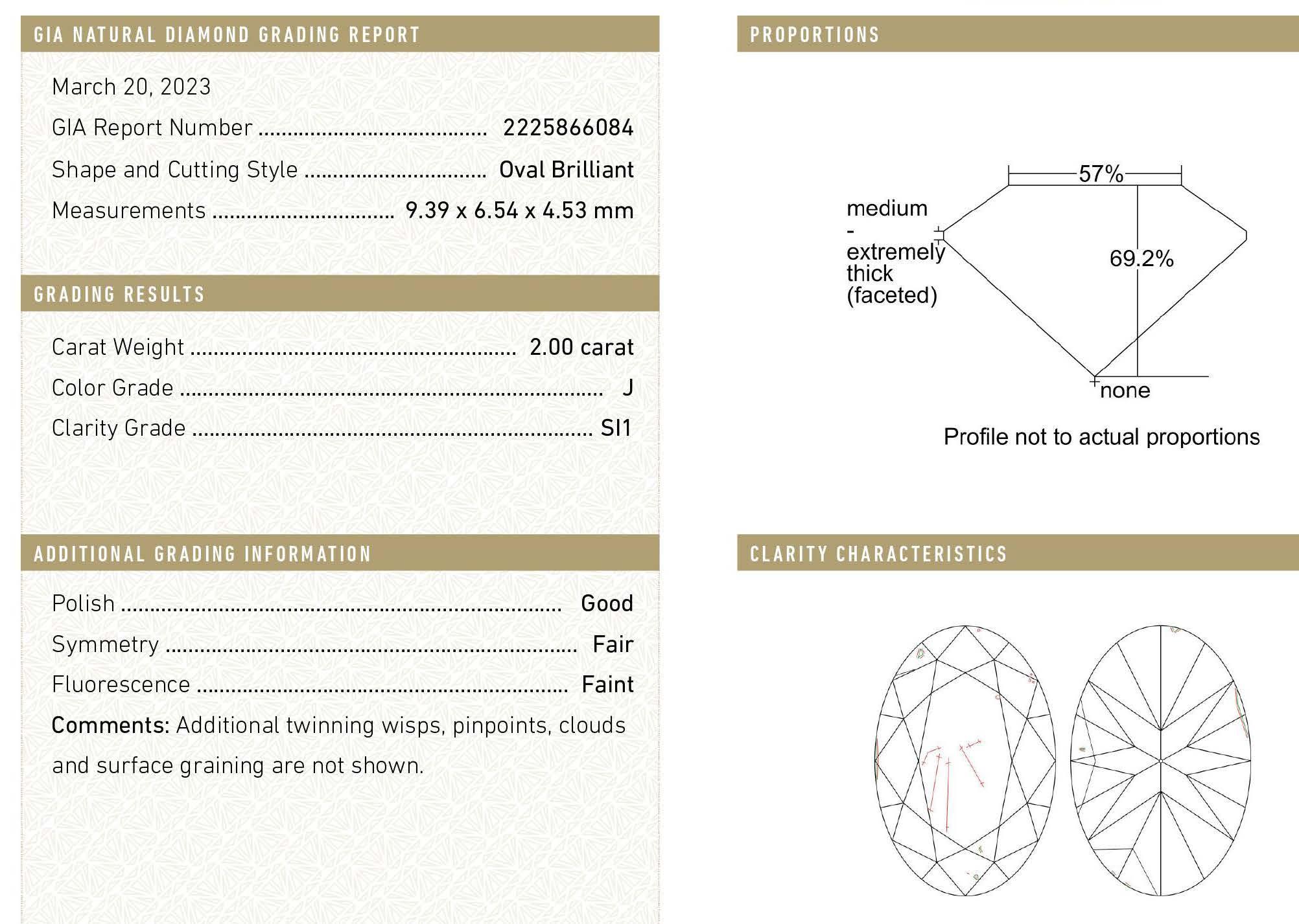 Los diamante con grado de pureza VS2 son extremadamente populares, ya que es el útilo grado que prácticamente garantiza un diamante libre de inclusiones a simple vista. Estas inclusiones solo se pueden ubicar utilizando una lupa de 10x. Aunque los diamantes de forma ovalada se introdujeron en la joyería hace más de 200 años, el corte ovalado moderno fue inventado a principios de 1960 por el destacado tallado de diamantes ruso Lazare Kaplan, este corte le valió un lugar en el Salón de la Fama Internacional de Joyeros.