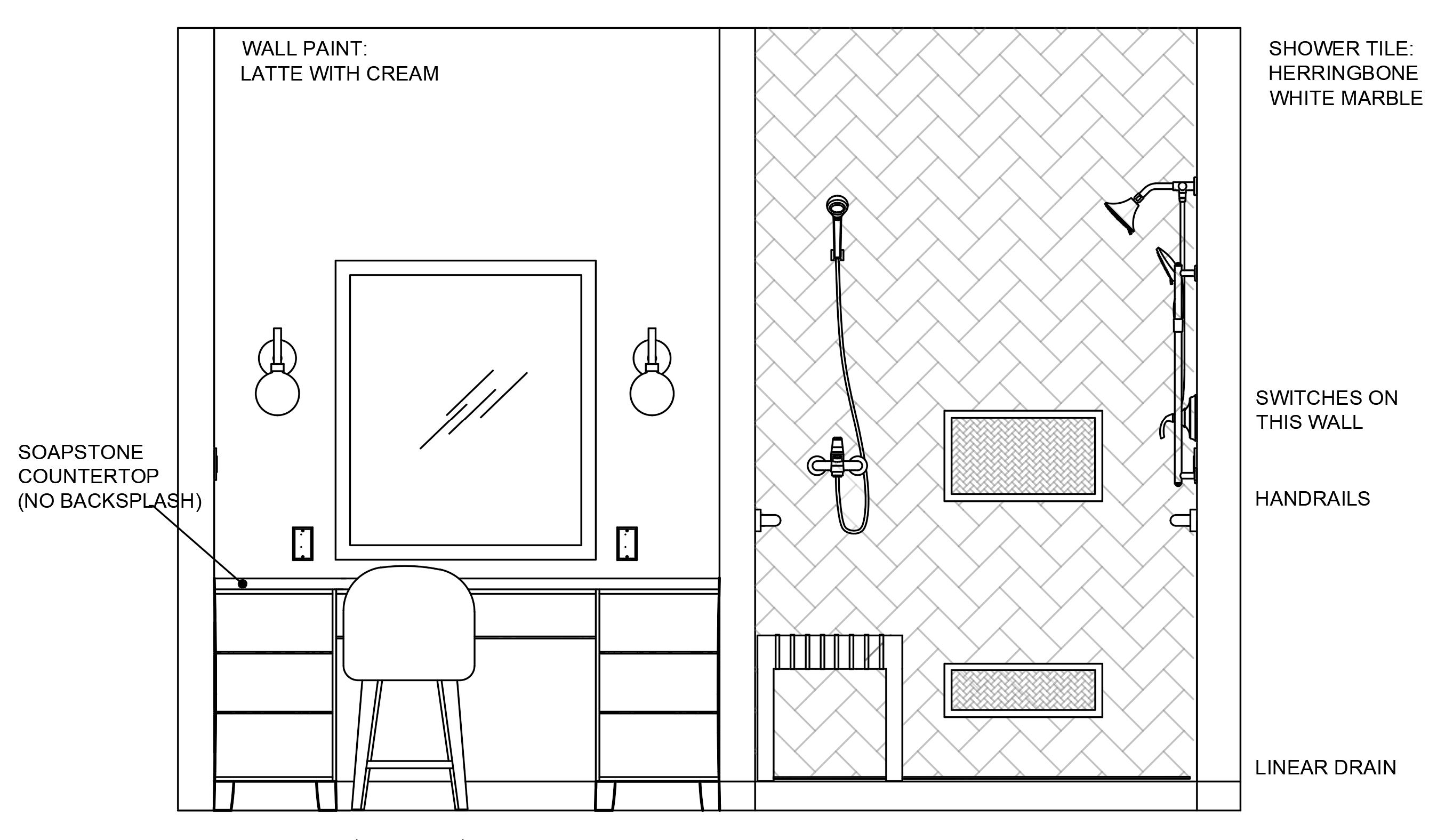 Convert tub to walk-in shower, move vanity away from main traffic path, increase storage, incorporate better lighting.