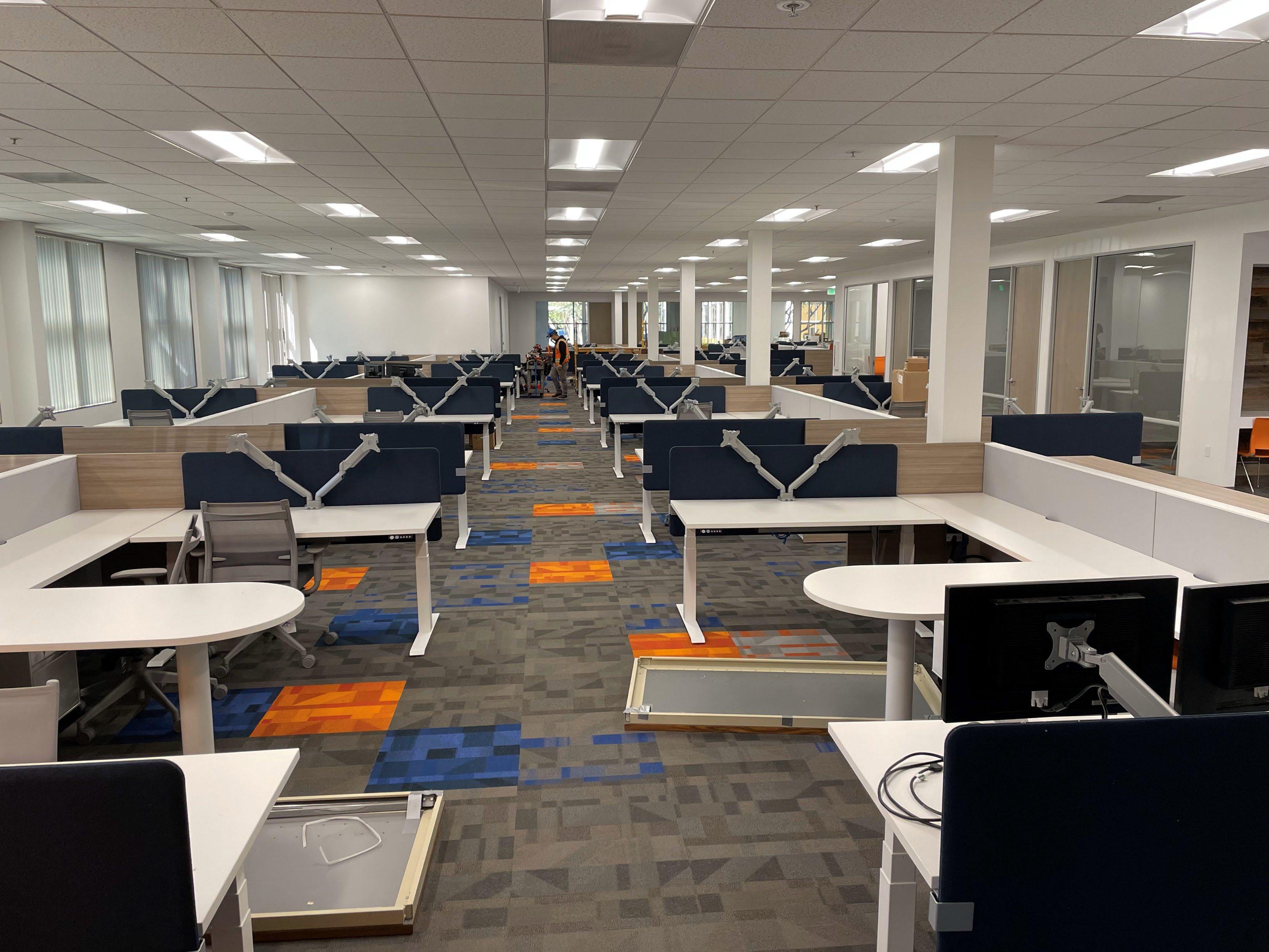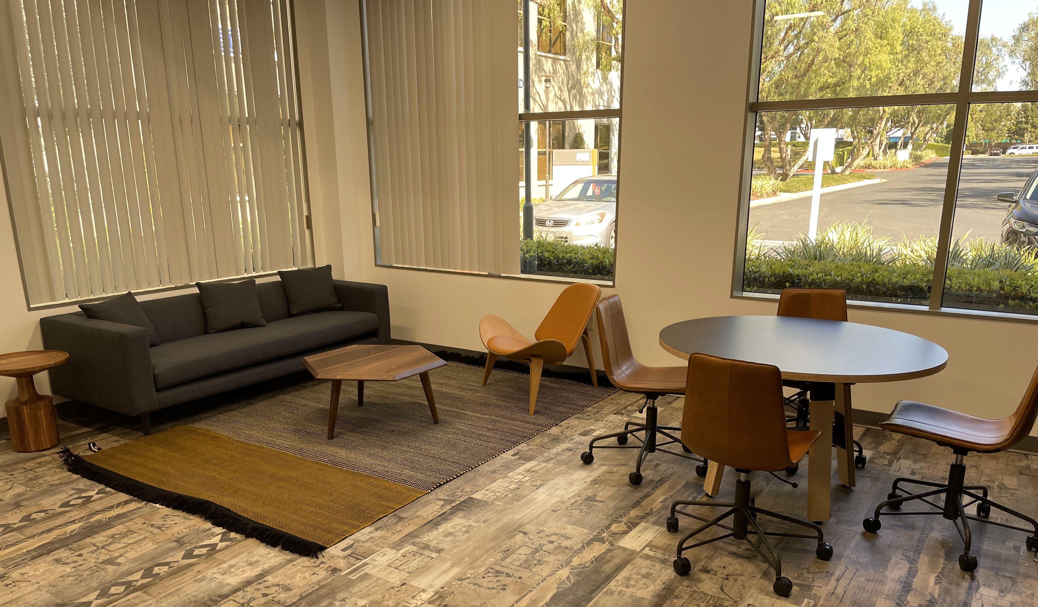 Complete remodel of corporate office that had furnishings from 1970. Client occupies first floor of building. Structural work including removing walls and creating an open office environment. The Austin Team partnered with Tangram Interiors and Sit on It Seating as well as Irvine Company to complete this renovation.