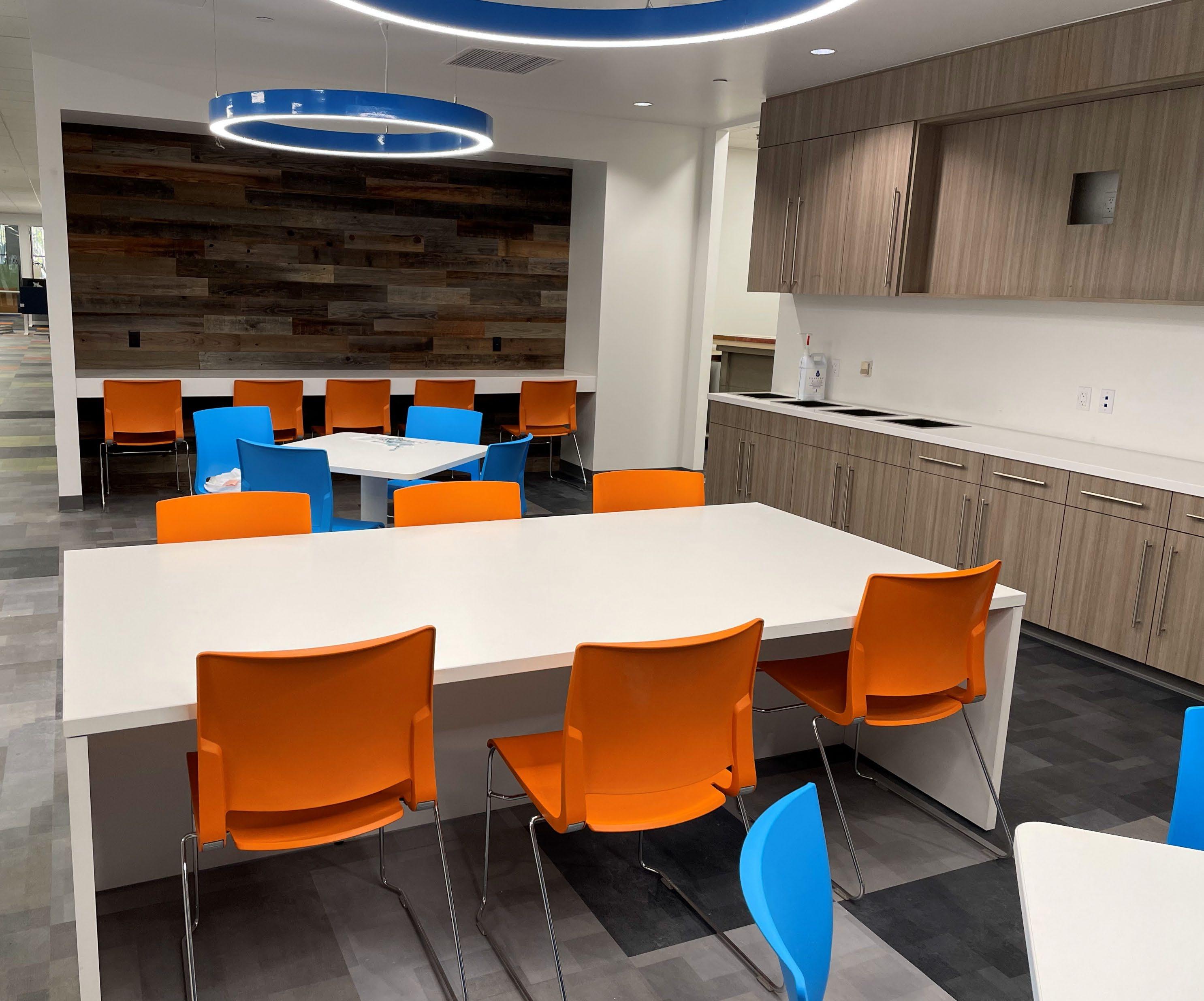 • Kitchen area includes coffee station, bottled water filler, microwaves and refrigerators
