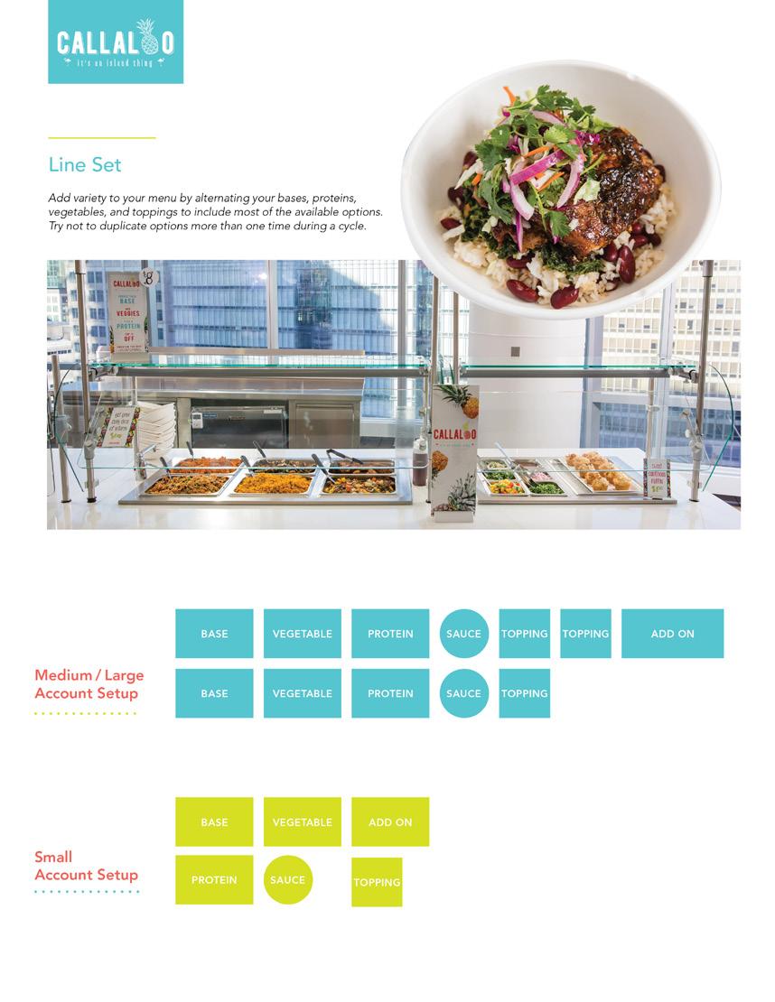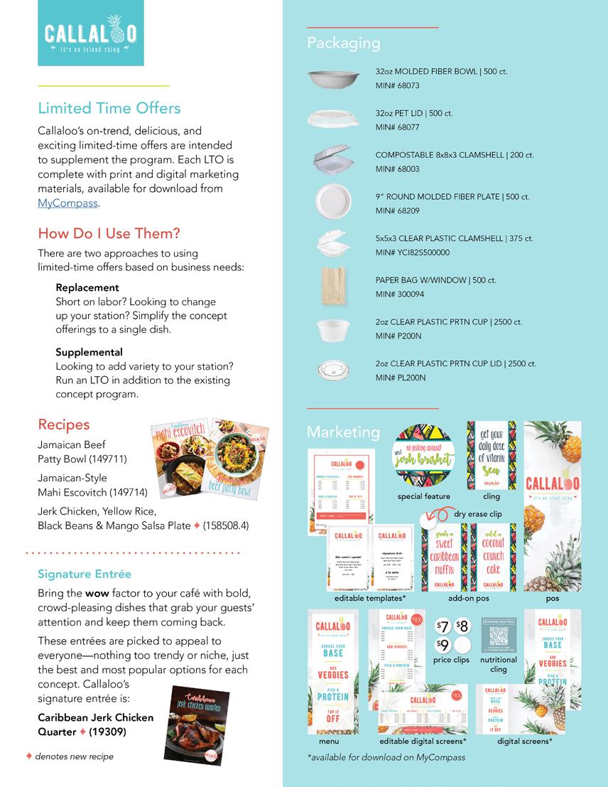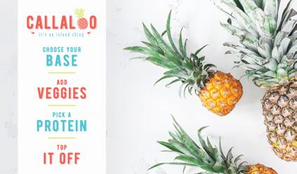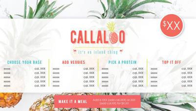 Are you running self-serve and/or weighand-pay? Do you have a special feature you’d like your guests to try? Want to offer Callaloo’s delicious veggies as an a la carte side item? We have a template for that! Take advantage of each concept’s editable full and half sheet print templates and/or editable digital menus to advertise special features and side items. Templates are available for download from MyCompass.