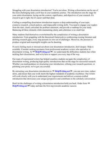 If you're feeling stuck or stressed out about your dissertation introduction, don't despair. Help is available. Consider seeking assistance from professional academic writers who specialize in dissertation writing. At ⇒ HelpWriting.net⇔, we understand the difficulties students face when tackling their dissertations, and we're here to support you every step of the way.