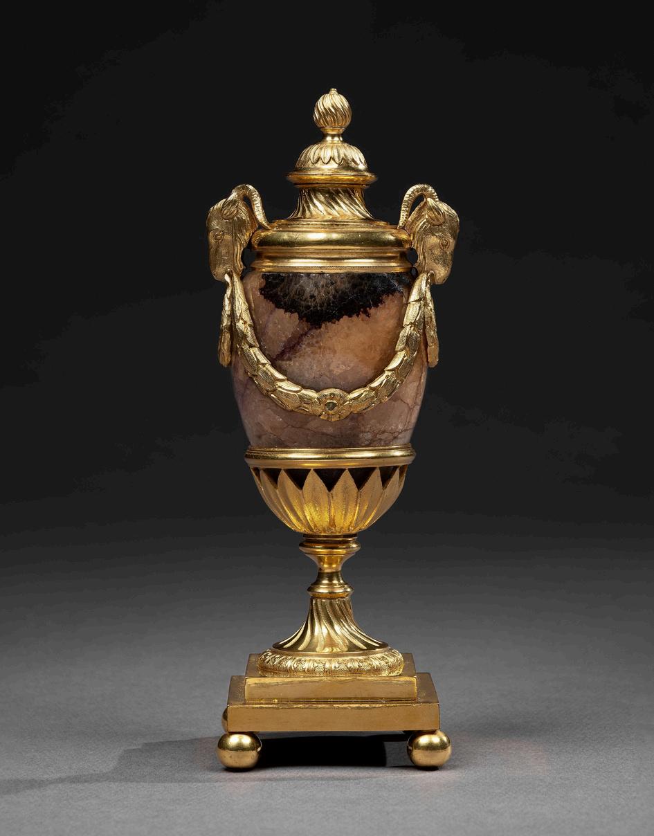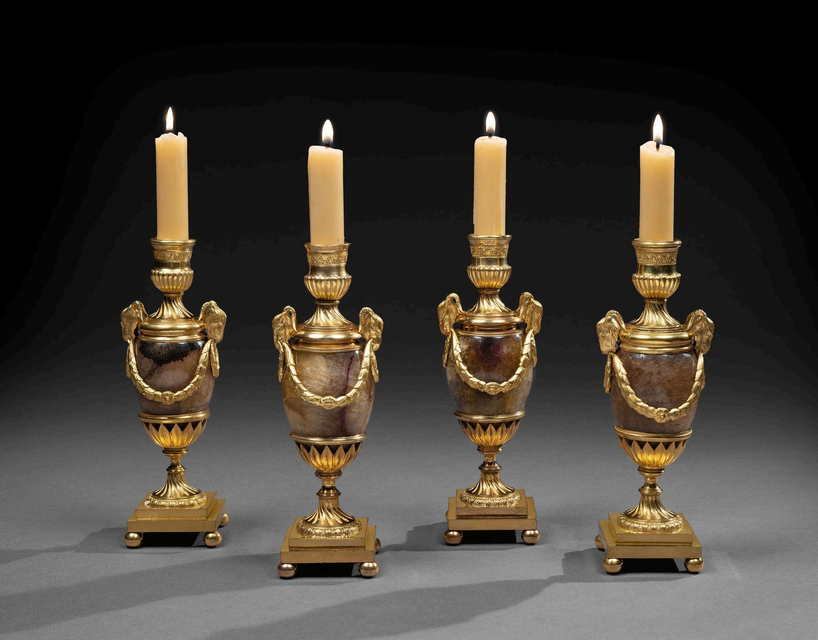 A SET OF FOUR ORMOLU MOUNTED BLUE JOHN CANDLE VASES BY MATTHEW BOULTON