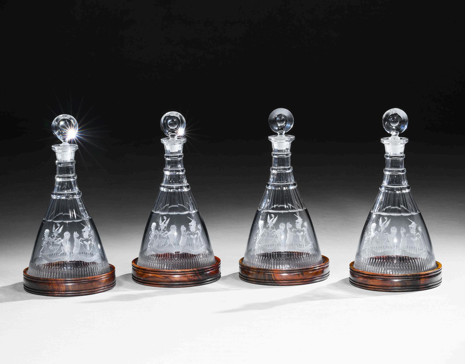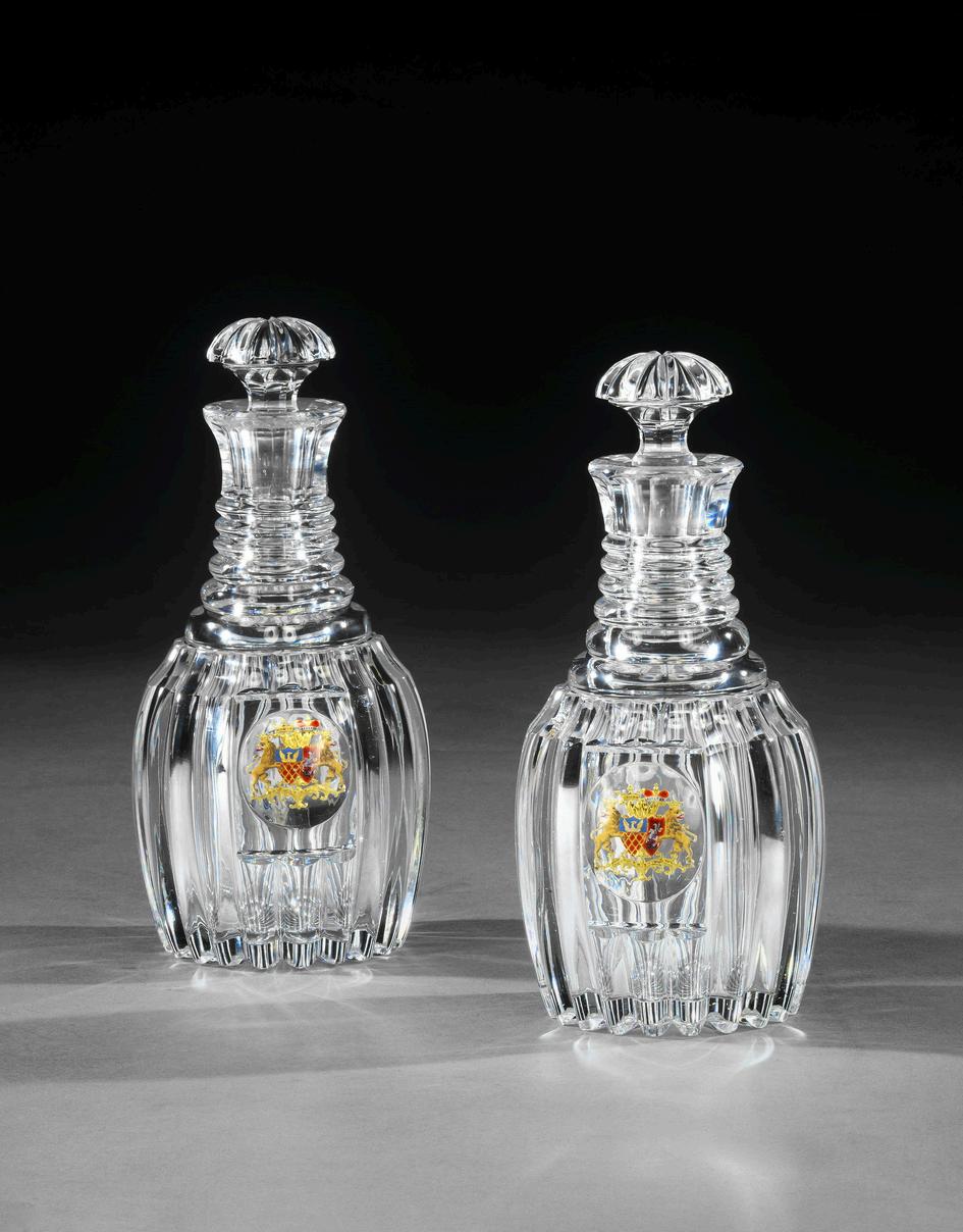 Each decanter is engraved with the family crests of the Graham and Cunningham families, probably to celebrate a wedding joining the two families.