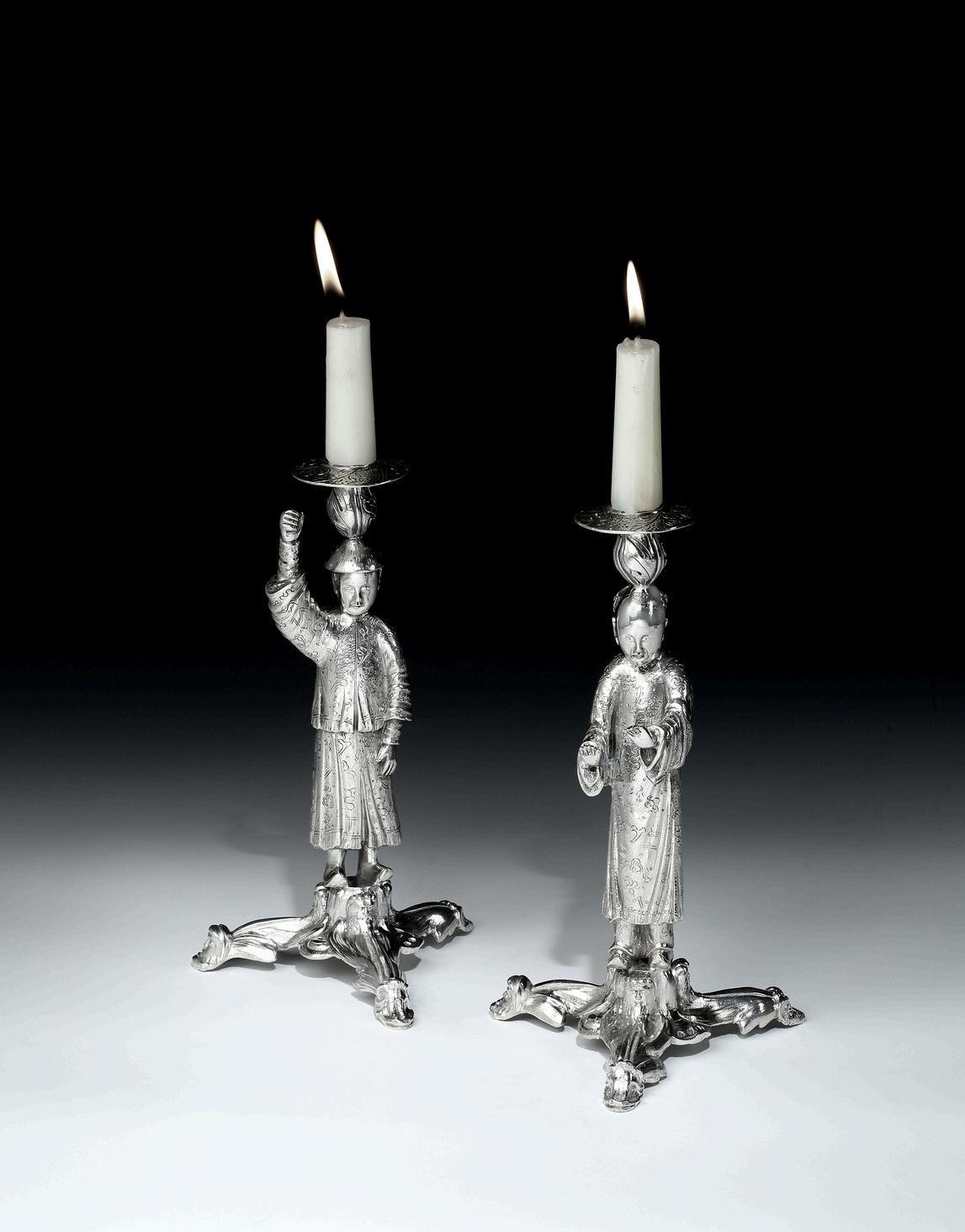 Little is known about Farrells early years. His earliest silver mark was not registered until 1813 making these candlesticks early examples of his creativity. His most productive period is when Farrell worked alongside the silversmith Kensington Lewis who supplied much of the silver to HRH The Duke of York (1763-1827). Farrell's style during this period was very much influenced by seventeenth century Dutch, Italian and German designs. Later work by Farrell after the Duke of York's death is more restrained, working with embossed surfaces rather than extravagant sculptural forms like these in the chinoiserie style of a mandarin and his consort.
