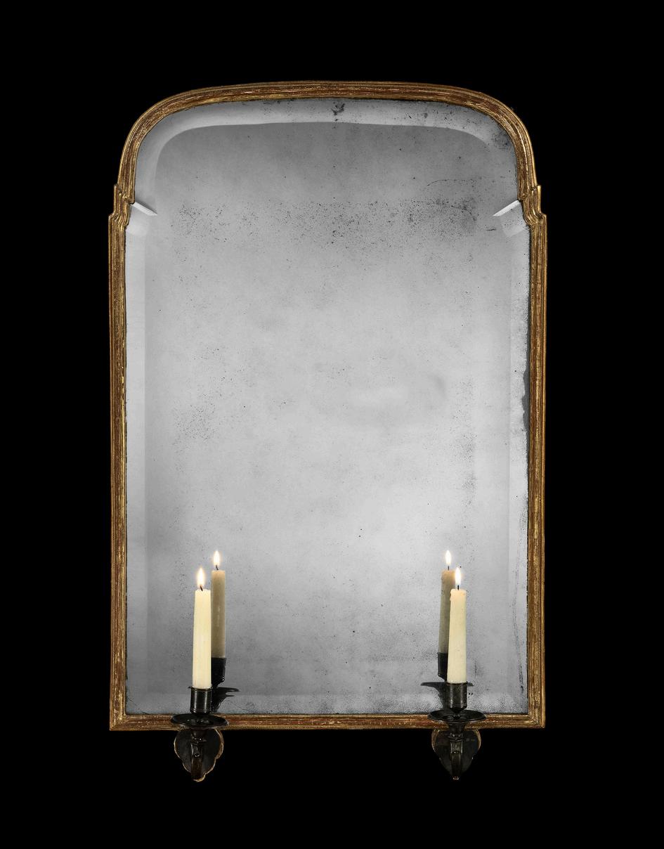 A fine early 18th century carved gesso and giltwood mirror, the original Vauxhall bevelled mercury plate within a shaped giltwood frame with brass sockles holding twin brass candle arms; an old storage label to the reverse for W. Page and Sons, St Albans.