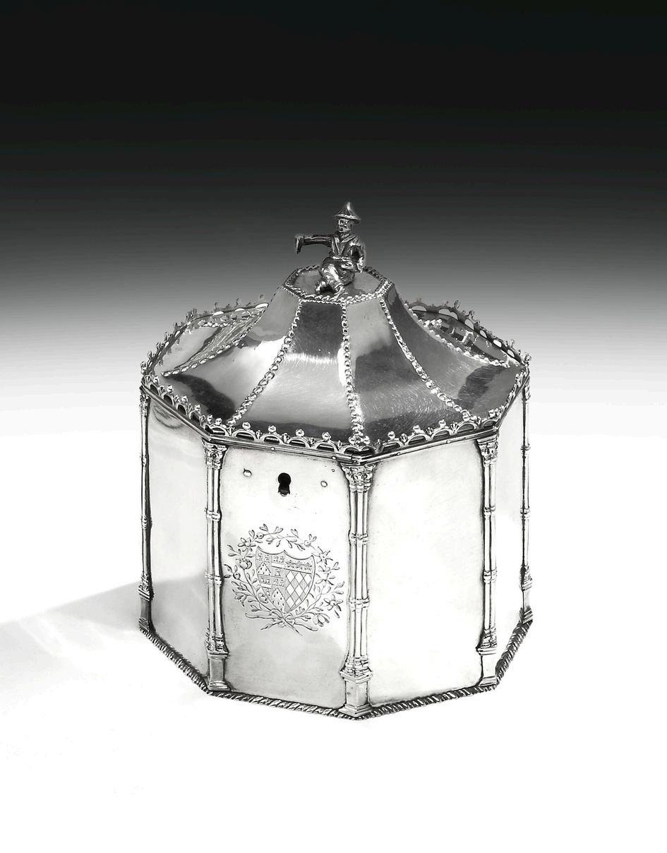 A fine mid 18th century sterling silver tea caddy of pagoda form by Edward Darvill, having an octagonal domed hinged lid with a Chinaman finial and fine scroll decoration to the rim, base and each corner.