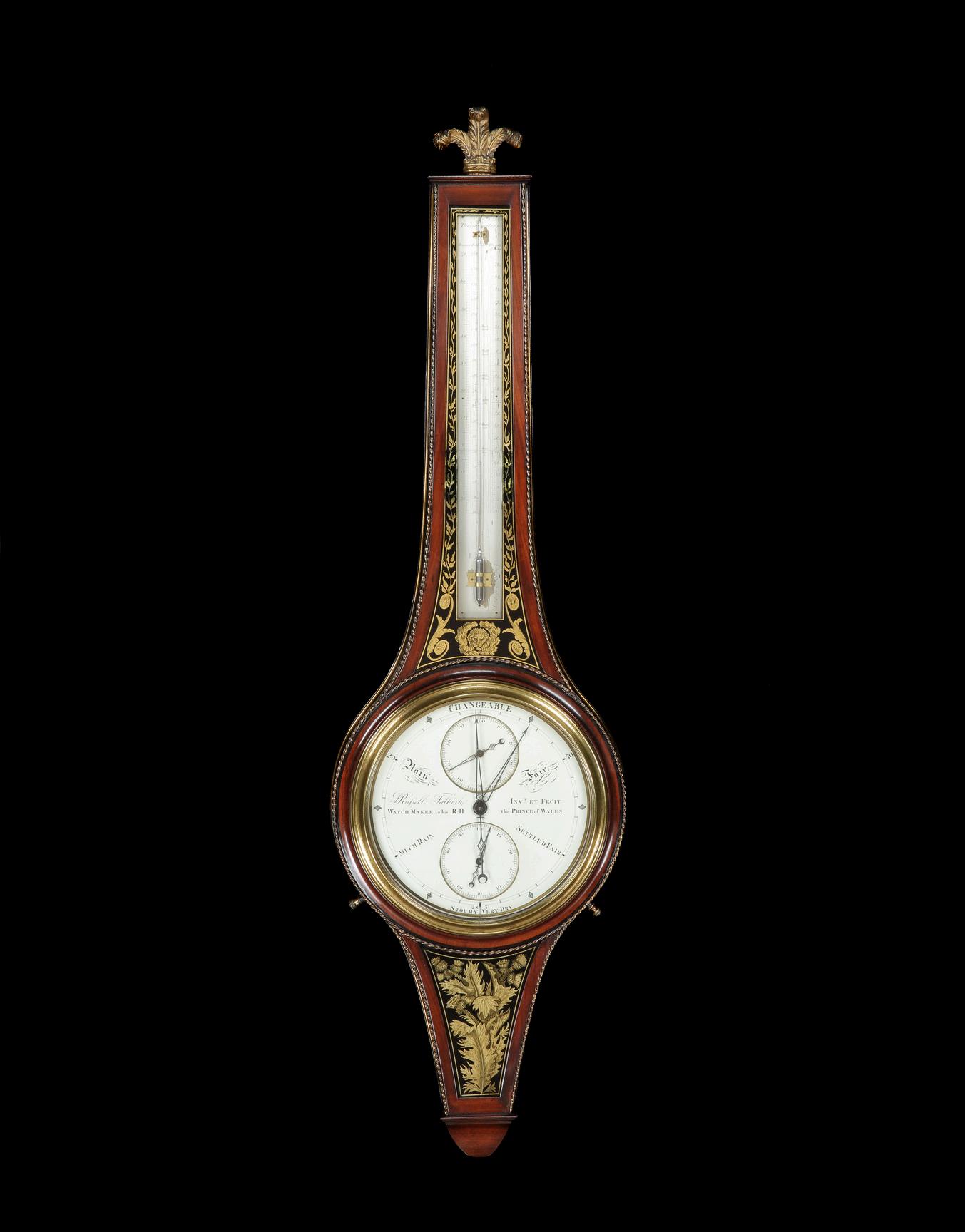 This barometer belongs to a small group of nearly identical banjo wheel instruments of exceptional quality made by the Scottish clockmaker John Russell. This type is referred to as the ‘Royal Pattern’ following Russell’s gift of one barometer to the Prince of Wales, later Prince Regent and then George IV. Two mahogany examples and a gilded version are still in the Royal Collection at Buckingham Palace, inscribed ‘Watchmaker to his R H the Prince of Wales’, indicating manufacture prior to 1811. The third is inscribed ‘Watchmaker to his R H the Prince Regent’.