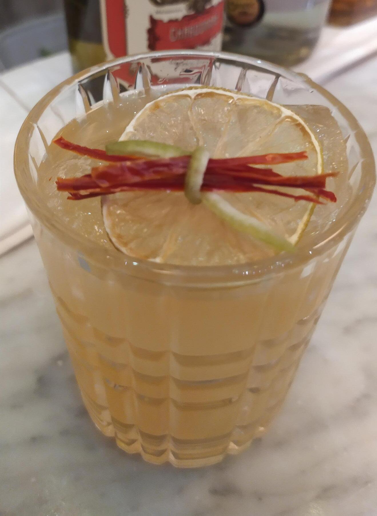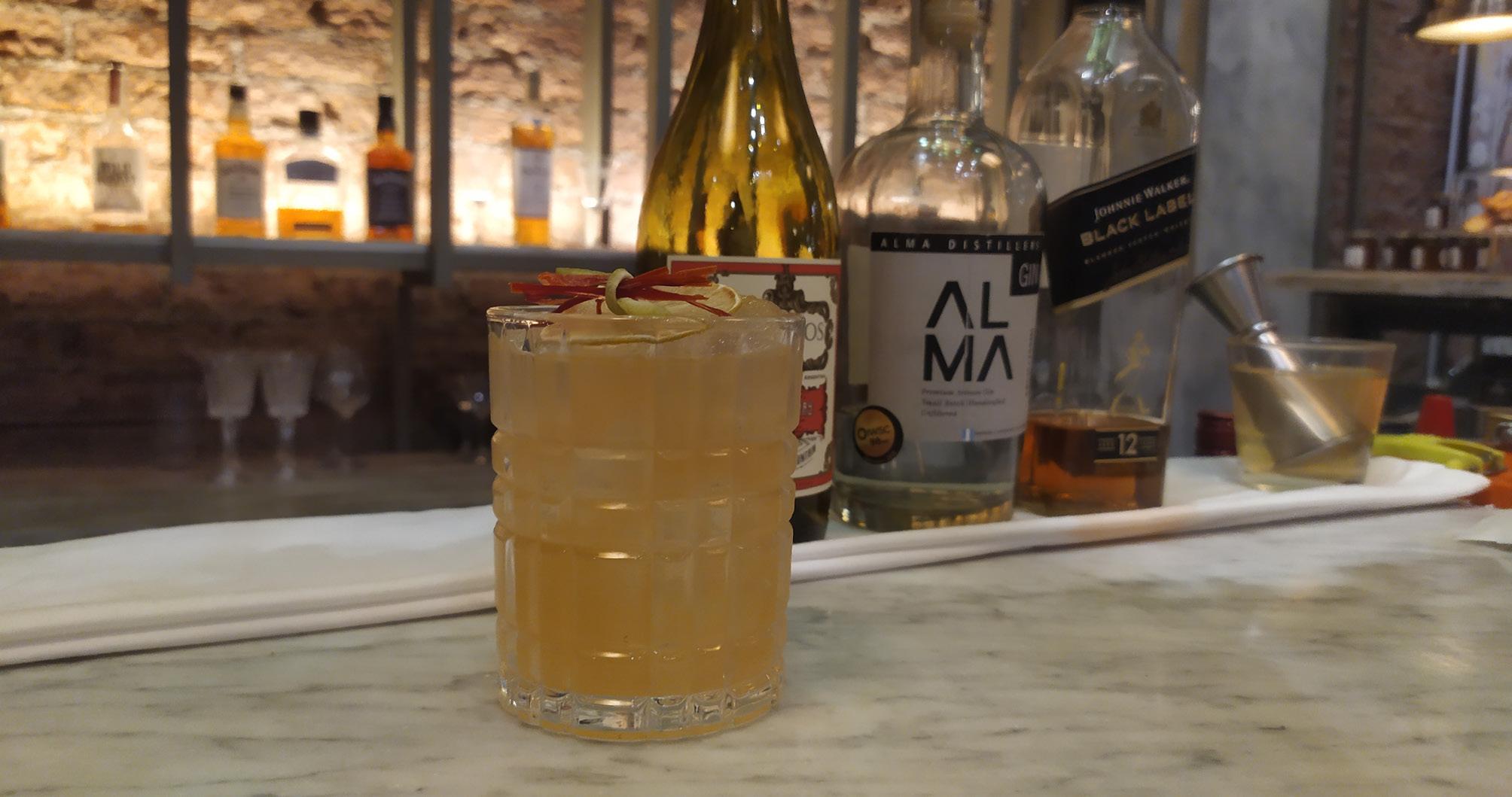 Para crearlo, utilicé el gin Alma, uno de mis favoritos y le di un toque amaderado con un poco de Black Label. El Chardonnay le dio equilibrio al coctel, mientras que el almíbar de ají le dio dulzura y un picor muy fuerte.