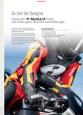 Du bist der Designer Gestalte Dein -Produkt nach Deinen eigenen Wünschen und Anforderungen! Da jeder einen anderen Geschmack bei Farben und Ausstattung hat, können Standardmodelle nicht immer alle Wünsche ideal abdecken. Deshalb kannst Du Deine Held Kombi und Handschuhe nach eigenen Wünschen und Anforderungen gestalten. Das nach Wunsch konfigurierte Held-Produkt ist ein in Handarbeit gefertigtes Einzelstück, welches all Deine Ansprüche, Vorstellungen und farblichen Wünsche in sich vereint, um eine optimale Verbindung zwischen Dir und Deiner Maschine zu schaffen.
