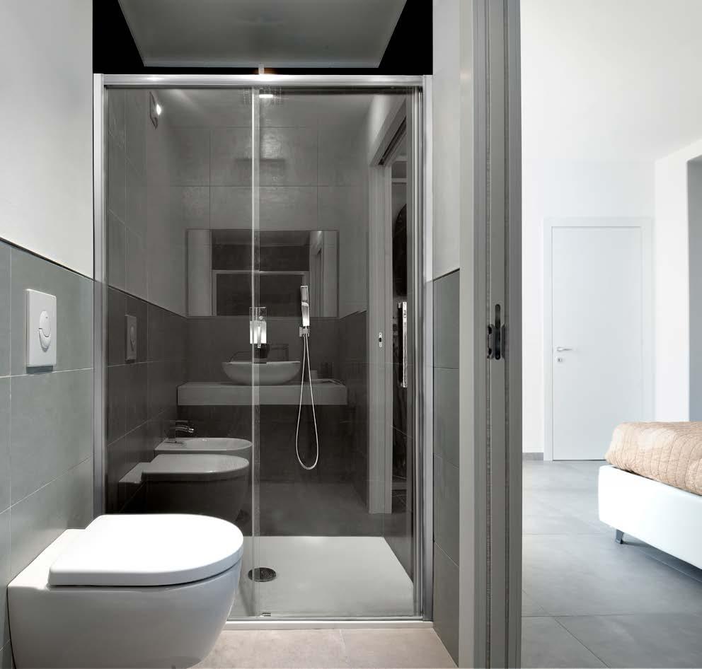 Eclipse es un artículo de muebles de ducha componible: se puede instalar individualmente con una altura de 90 cm o ordenando n° 2 piezas se pueden ensamblar creando una solución de 180 cm. Eclipse se puede instalar en placas de vidrio sin perfil superior. La instalación descansa sobre el vidrio y por lo tanto se extrae fácilmente.