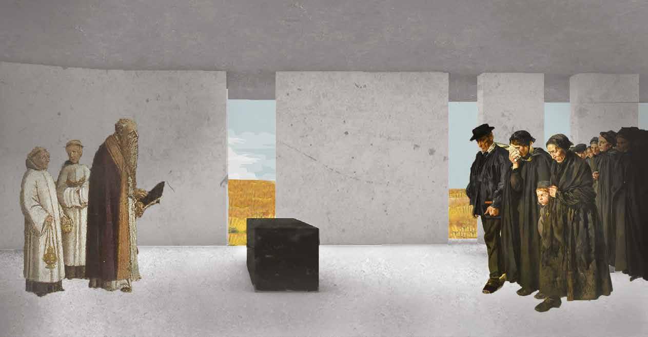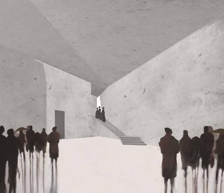 In the context of “Architectural Design VI”, I dealt with a very special topic, “Goodbye Architecture”. Specifically, I had the chance to design a crematorium in a suburb of Patras, Rio. The idea comes from a "rock" that falls on the ground. By drawing pathways and finding a choreography of movement in them, the visitor finds himshelf within a peaceful landscape that allows him to escape from the lamentable feelings and relax. The rock is divided into three levels. In the basement there is the church, which is revealed by the difference in al�tude between the paths and the rock. The entrance area and recep�on are located on the ground floor and behind them is the burning area. Although the entrance with the burning area are located on the same level, they are separated and hidden from each other, crea�ng a different atmosphere and not intervene with each other. Upstairs, there is the ceremony room, which one can choose instead of the church ceremony. At the end of the ceremony, the room’s wall is opened, allowing light to enter the room and lead the guests to the balcony, which is oriented towards the peaceful natural landscape.