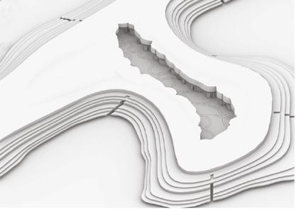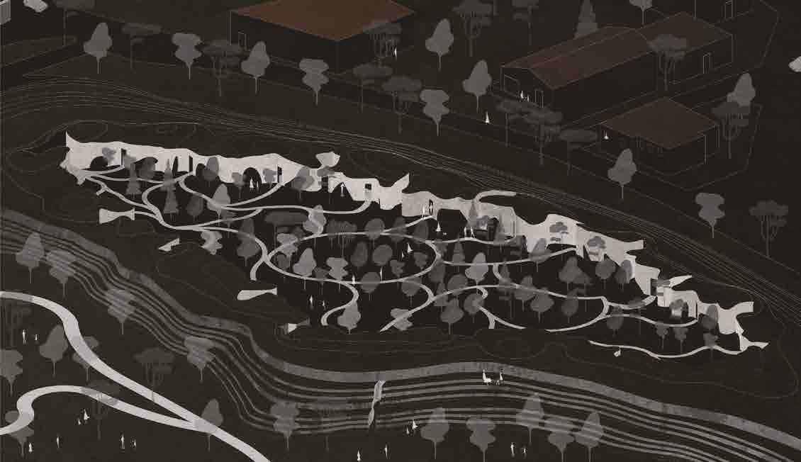 In the context of “Architectural Design VII”, we were asked to create a residen�al complex in the suburbs of Patras, specifically in the area of Gla�os. The idea was to create a new landscape, where the houses are hidden in, and at the same �me, create the main square of the suburb, which is currently absent from the area. In order to create this new landscape, we use rubbles, which are first placed on the area and a�er covered with soil. The main idea was that the landscape grows as more rubbles are brought in the area, crea�ng the depicted volume. To u�lize the rubbles, we u�lized the exis�ng abandoned factory, in which the ini�al processing would be carried out and then the materials would be used either for the construc�on of houses, or placed in the area to enlarge the landscape.